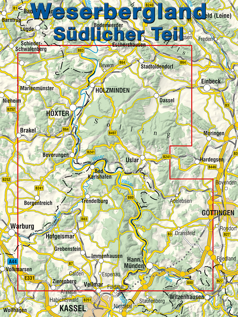 Das Weserbergland ist eine Mittelgebirgslandschaft beidseits der Weser zwischen Hann. Münden und Porta Westfalica. Die größte zusammenhängende Waldfläche des Weserberglandes liegt im Solling und setzt sich nach Süden im Reinhardswald, links der Weser und dem Bramwald, rechts der Weser fort. Im Tal der Weser verläuft der 520 km lange, als 4 Steme-Qualitätsradroute ausgezeichnete Weser-Radweg und gibt zusammen mit dem regionalen Radwegenetz vielfältige Möglichkeiten das Weserbergland per Rad zu entdecken.Der prämierte Qualitätsweg Weserberglandweg verläuft auf überwiegend naturnahen Wegen von Hann. Münden bis Porta Westfalica auf rund 225 km durch das Weserbergland und bildet den zentralen Weg in einem dichten Wanderwegenetz.Die neue 3. Ausgabe der reiß- und wetterfesten Rad- und Wanderkarte "Weserbergland - Südlicher Teil" stellt im Maßstab 1:50 000 die Region Schwallenberg - Stadtoldendorf - Holzminden - Höxter - Bad Karlshafen - Borgenteich - Hofgeismar - Dransfeld bis Hann. Münden - Zierenberg und Fuldatal mit dem Rad- und Wanderwegenetz vor.