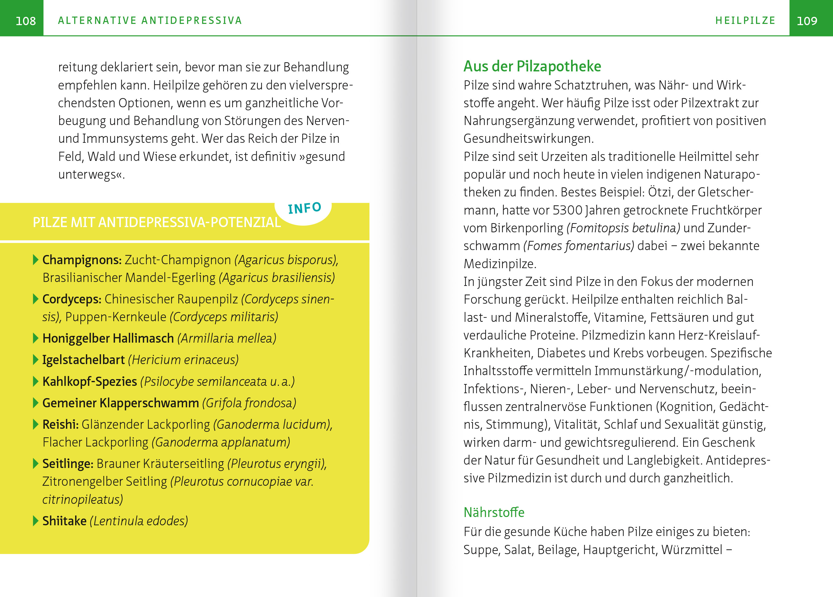 INHALTVorwortGRUNDLAGEDas Kontinuum der Gefühle- Normale Stimmungsschwankungen- Stimmung außer KontrolleDepression- Symptome der Depression- Die depressive Verstimmung- Die depressive Episode- Ursächliche Faktoren- Verlauf und Prognose- Antidepressive TherapienNATÜRLICHE ANTIDEPRESSIVANähr- und Körperstoffe- Fettsäuren- Aminosäuren- CholinVitamine- Vitamin B1- Vitamin B3- Vitamin B6- Vitamin B9- Vitamin B12- Vitamin C- Vitamin DMineralstoffe- Calcium- Eisen- Lithium- Magnesium- Selen- ZinkHormone- Schilddrüsenhormone- Sexualhormone- Dehydroepiandrosteron- PregnenolonAntidepressive NaturstoffeALTERNATIVE ANTIDEPRESSIVAHeilkräuter- Johanniskraut- Sibirischer Ginseng- Rosenwurz- BaldrianCannabis - ein Hanfgewächs- Cannabis-Spezies und Wirkstoffe- Endocannabinoidsystem- Cannabis-Medizin- Cannabinoide bei psychischen Störungen- Cannabinoide bei DepressionHeilpilze- Aus der Pilzapotheke- Cordyceps - Puppen-Kernkeule- Reishi - Glänzender Lackporling- Hericium - Igelstachelbart- Psilocybe - psychoaktive HeilpilzeKomplementäre Therapie- Aromatherapie- Homöopathie- Akupunktur- LichttherapieSchlafkuren- Schlafentzug- SchlafphasenvorverlagerungStressabbau- Autogenes Training- Progressive Muskelrelaxation- Yoga- MeditationHeilkünste- Musik- Bildende Kunst- SchreibenPsychotherapie- Basispsychotherapie- Tiefenpsychologie/Psychoanalyse- Verhaltenstherapie- Interpersonelle Psychotherapie- GruppentherapieInfoserviceRegister