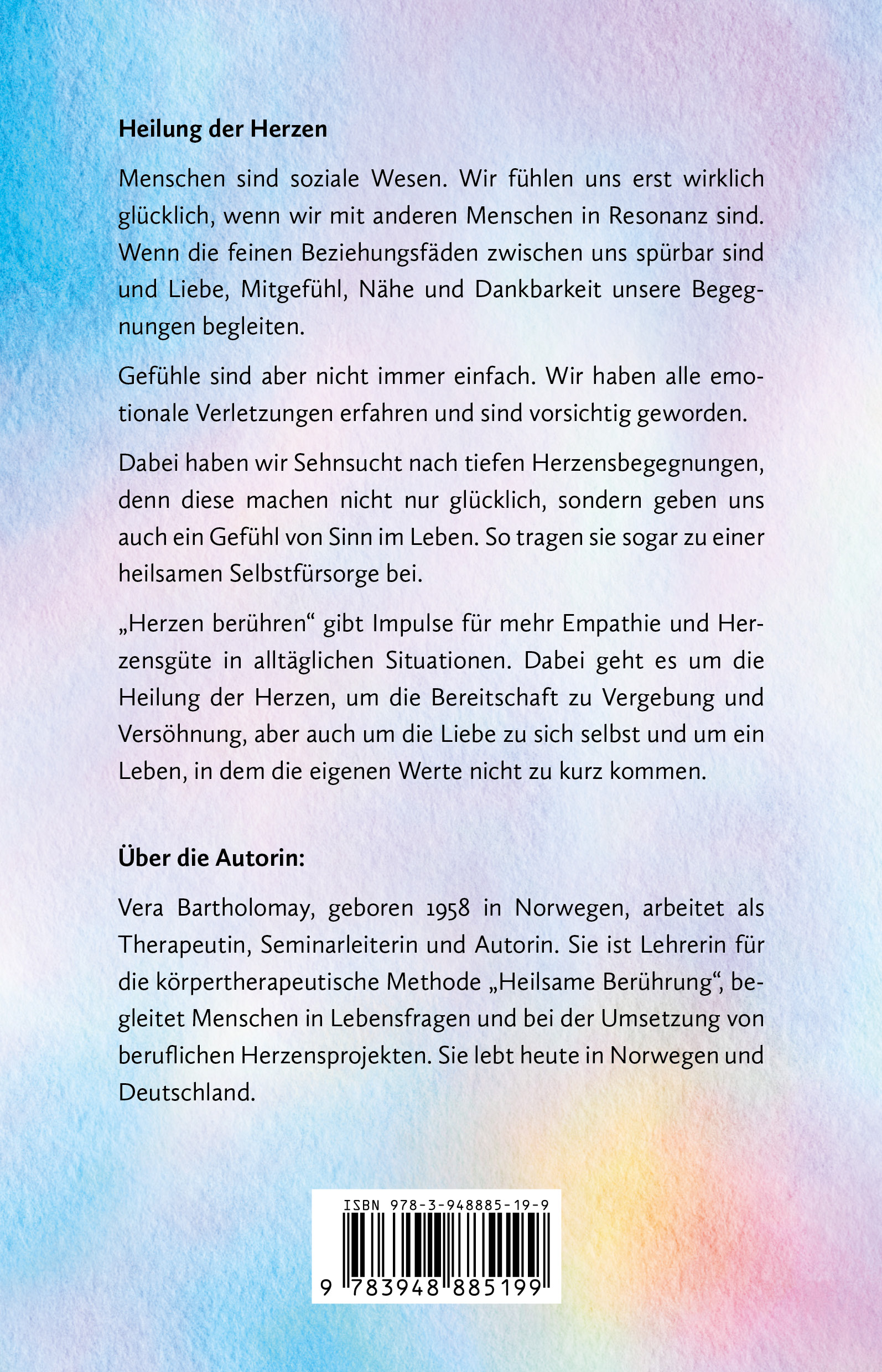 Vera Bartholomay ist Autorin, Seminarleiterin und Therapeutin. In ihrer Arbeit und Büchern geht es um die energetische Körpertherapie „Heilsame Berührung“, um persönliche und berufliche Herzensthemen. Ihre Seminare finden in Deutschland und in der Schweiz statt. Die gebürtige Norwegerin lebt heute in Norwegen und Deutschland.