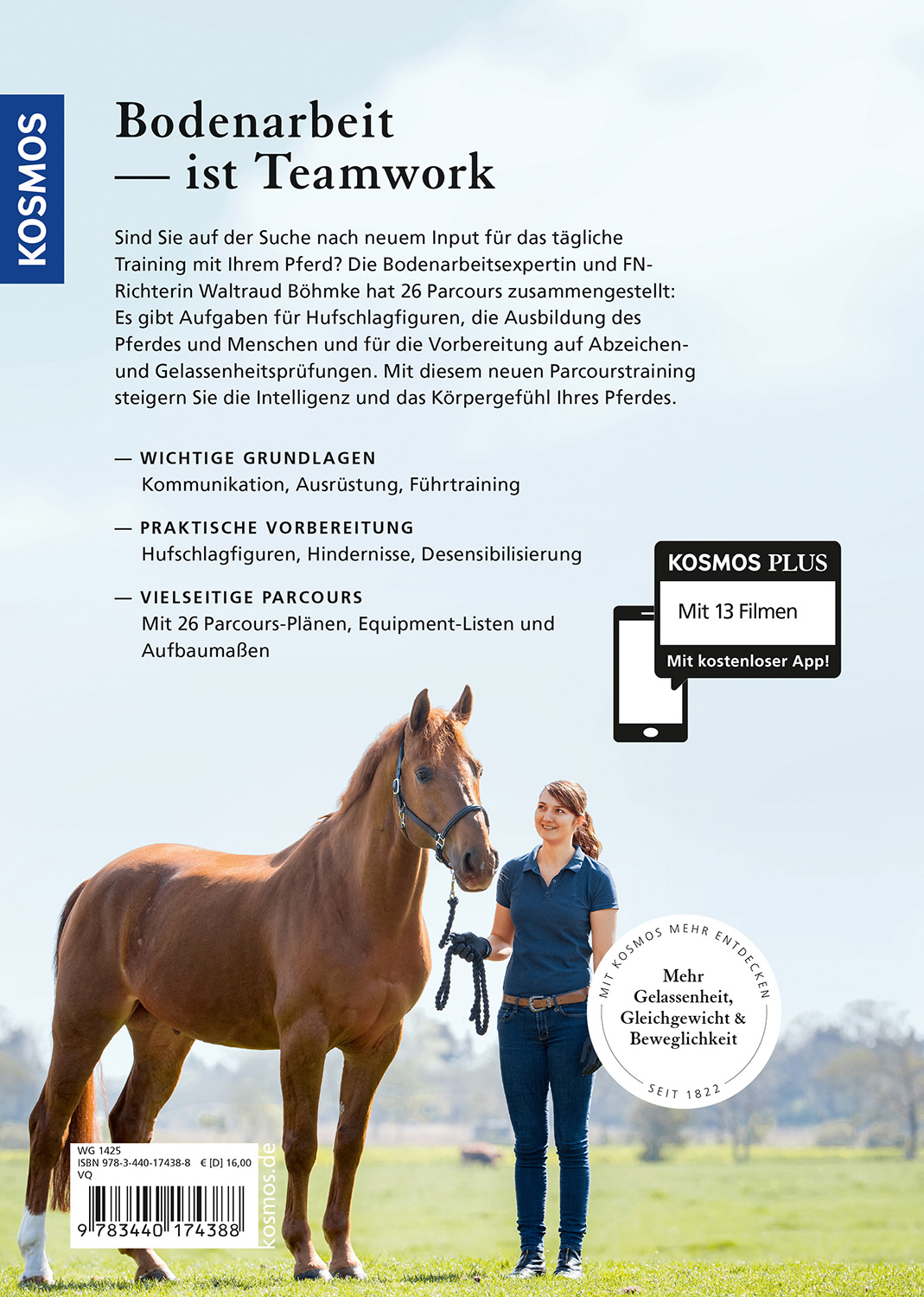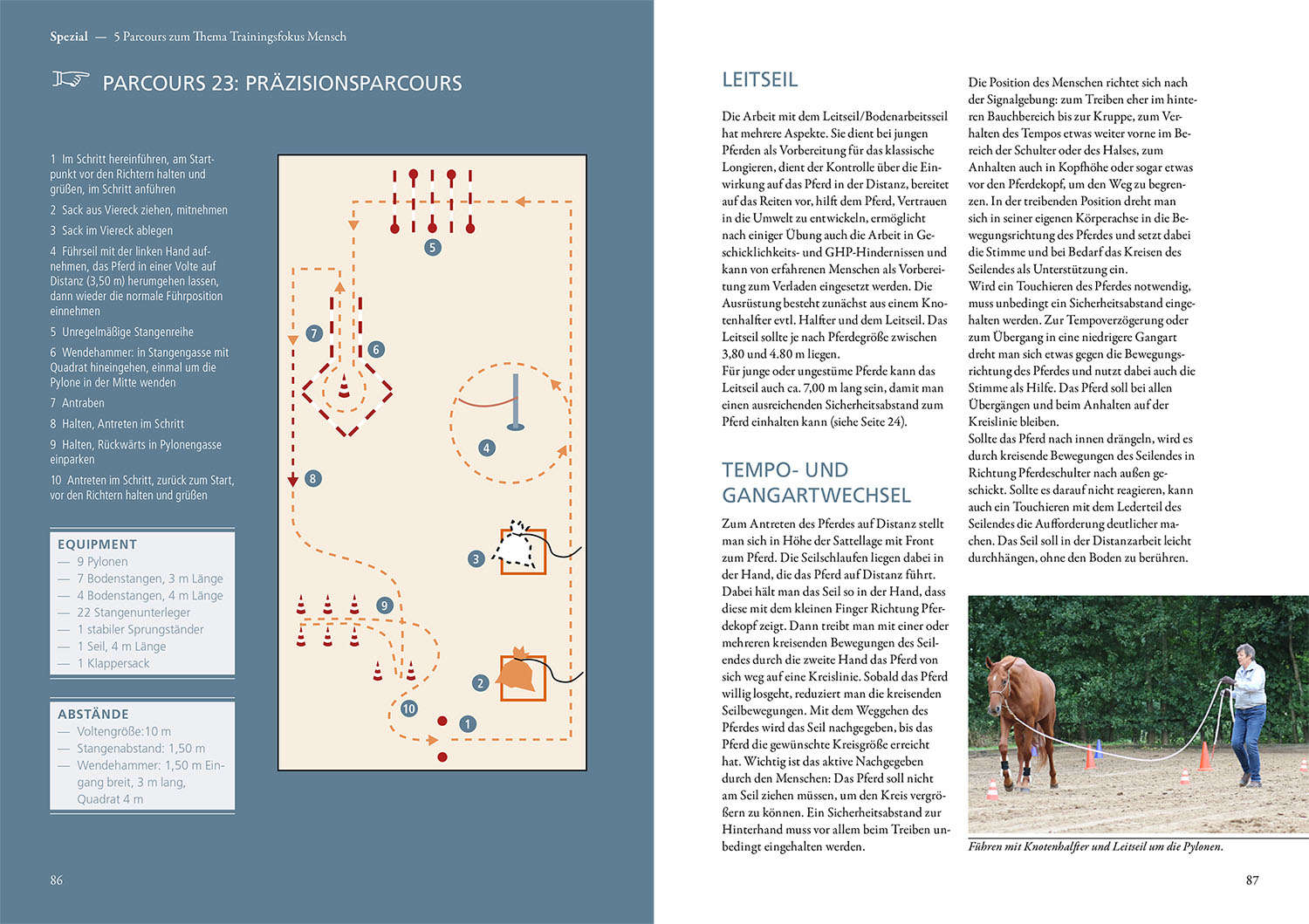 Auf den Reitplatz und los! Aber diesmal nicht zum Reiten, sondern um spannende und abwechslungsreiche Parcours für die Bodenarbeit zu üben. Die erfahrene Pferdewirtin und Trainerin Waltraud Böhmke stellt 25 Parcours mit verschiedenen Zielsetzungen vor: zur Gymnastizierung, für Gelassenheitstraining, Umgangsregeln und Geschicklichkeit. Über 100 Fotos und 25 Zeichnungen machen den Aufbau leicht. Die Übungsabläufe machen Spaß, fördern das Teamwork und dienen zugleich als gezieltes Training für die Abzeichenprüfung.