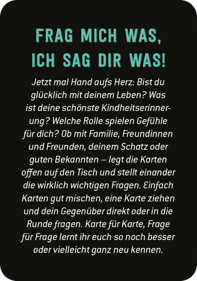 Ob mit Freund:innen, Bekannten oder deiner Familie, deinem Schatz oder deinem Lieblingsmenschen - legt die Karten offen auf den Tisch und stellt einander die wirklich wichtigen Fragen. Lernt euch so noch besser oder vielleicht ganz neu kennen. Tiefgründig, philosophisch, persönlich und vielleicht etwas ungewöhnlich, in dieser Kartenbox findest du alle Fragen, die du brauchst!