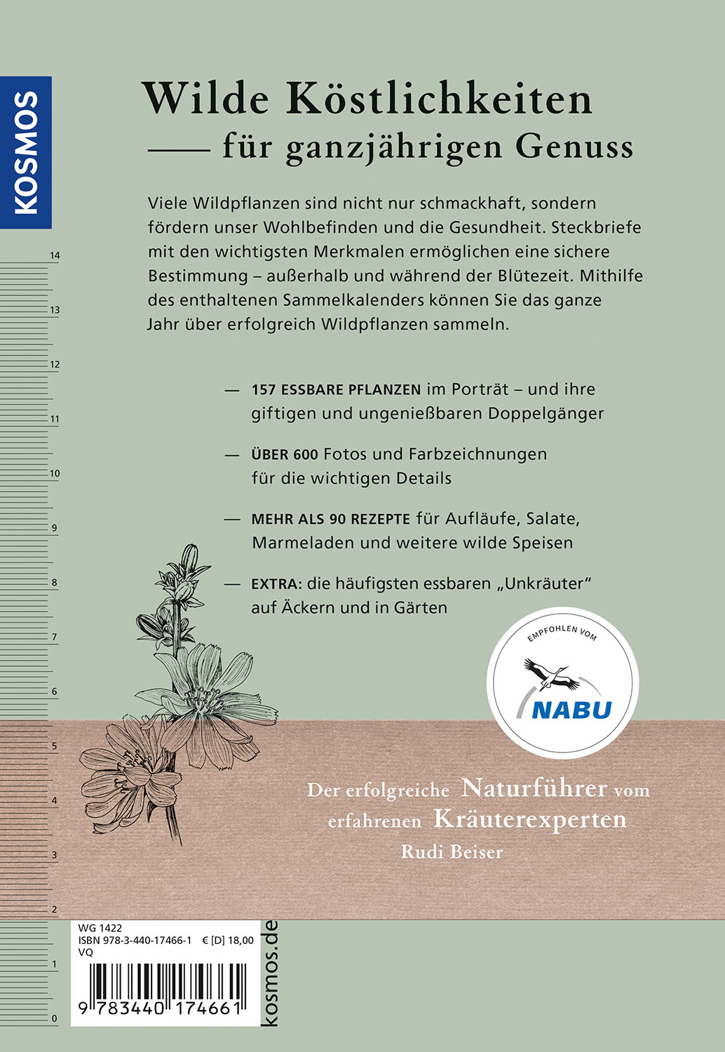 Auf der Wiese, hinter dem Haus und im Wald wachsen überraschend viele Pflanzen, die unseren Speiseplan bereichern. Kräuterexperte Rudi Beiser zeigt, wie man essbare Wildpflanzen findet und sicher bestimmt. Über 600 Fotos und Zeichnungen sowie ausführliche Beschreibungen informieren über alle wichtigen Merkmale. Wo Verwechslungsgefahr mit ungenießbaren Arten besteht, werden die Doppelgänger direkt gegenübergestellt. Der Rezeptteil bietet zahlreiche Anregungen für wunderbare Salate, Suppen oder Nachspeisen und zum nährstoffschonenden Konservieren der wilden Köstlichkeiten.