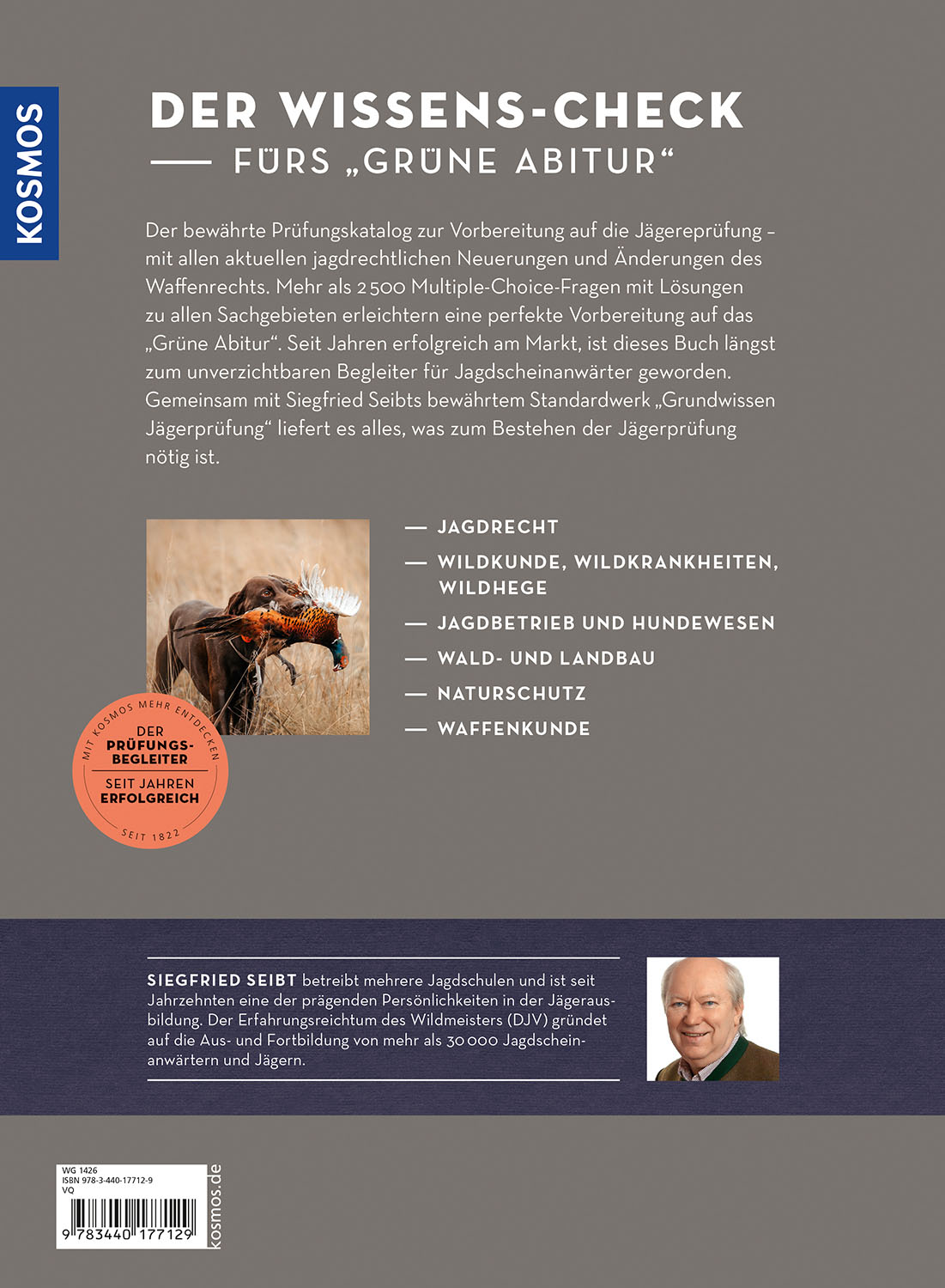 Nach verschiedenen Änderungen der jagdrelevanten Gesetzgebung und des Waffenrechts legt Siegfried Seib kurz nach Neuerscheinen seines Standardwerks "Grundwissen Jägerprüfung" auch eine Neuausgabe seines Prüfungsfragenbuchs vor. Mehr als 2.500 Fragen aus allen Sachgebieten im Multiple-Choice-Verfahren, die im "Grünen Abitur" der Bundesländer gestellt werden können - natürlich mit den richtigen Lösungen! Ideal zur Überprüfung des Lernfortschritts und zur Vorbereitung auf die schriftliche Prüfung!