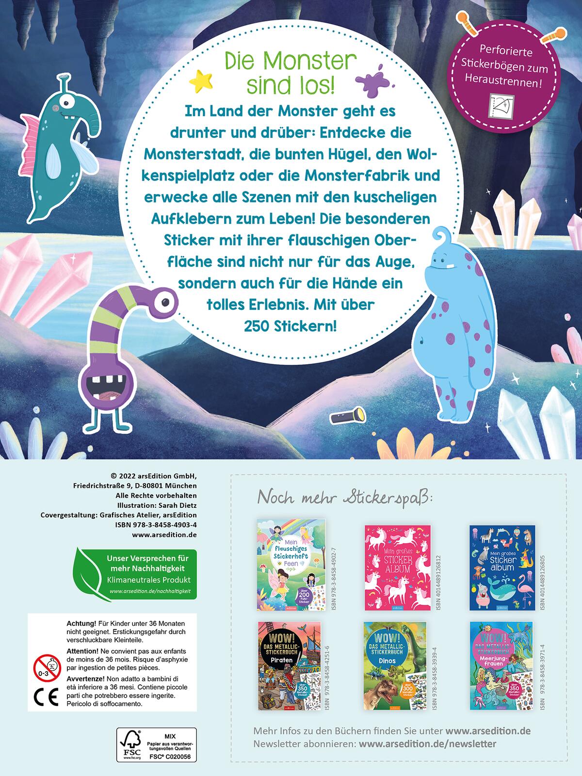 Im Land der Monster geht es drunter und drüber: Entdecke die Monsterstadt, das Land der bunten Hügel, den Wolkenspielplatz oder die Monsterfabrik und belebe alle Szenen mit den über 250 kuscheligen Aufklebern zum Leben!