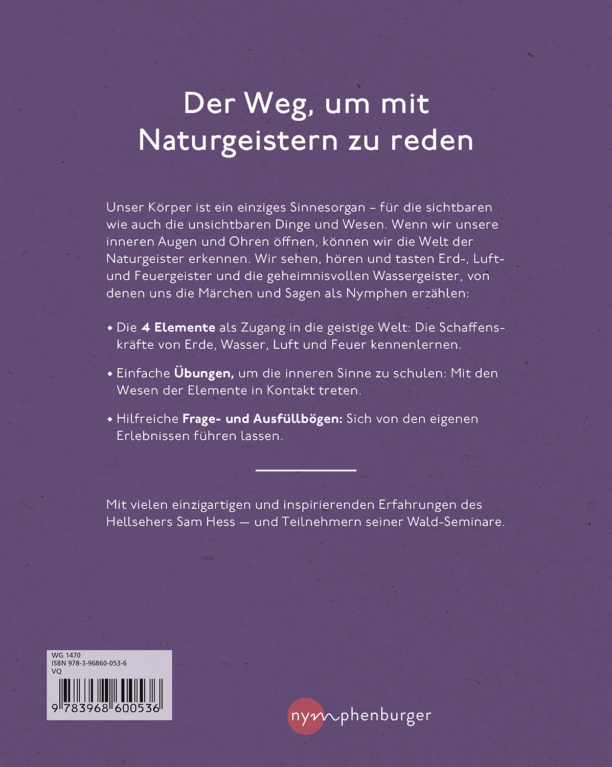 Sam Hess ist in der Welt der Naturgeister zu Hause. Jede Woche geht er mit Menschen in den Wald, um ihnen zu zeigen, wie man jene Wesen, die die Elemente Erde, Feuer, Wasser und Luft bewohnen, wahrnehmen kann. Das Praxisbuch zu seinem Bestseller macht es nun möglich, durch eigene Vertiefung mit Zwergen, Feen, Nymphen und Sylphen in Verbindung zu treten und so ihre Kraftwirkung und Heilimpulse zu erfahren. Durch konkrete Übungen, klare Anweisungen und Ausfüllseiten für persönliche Bewusstwerdungen öffnet sich der Weg für den Kontakt mit der unsichtbaren Welt der Elementarwesen.