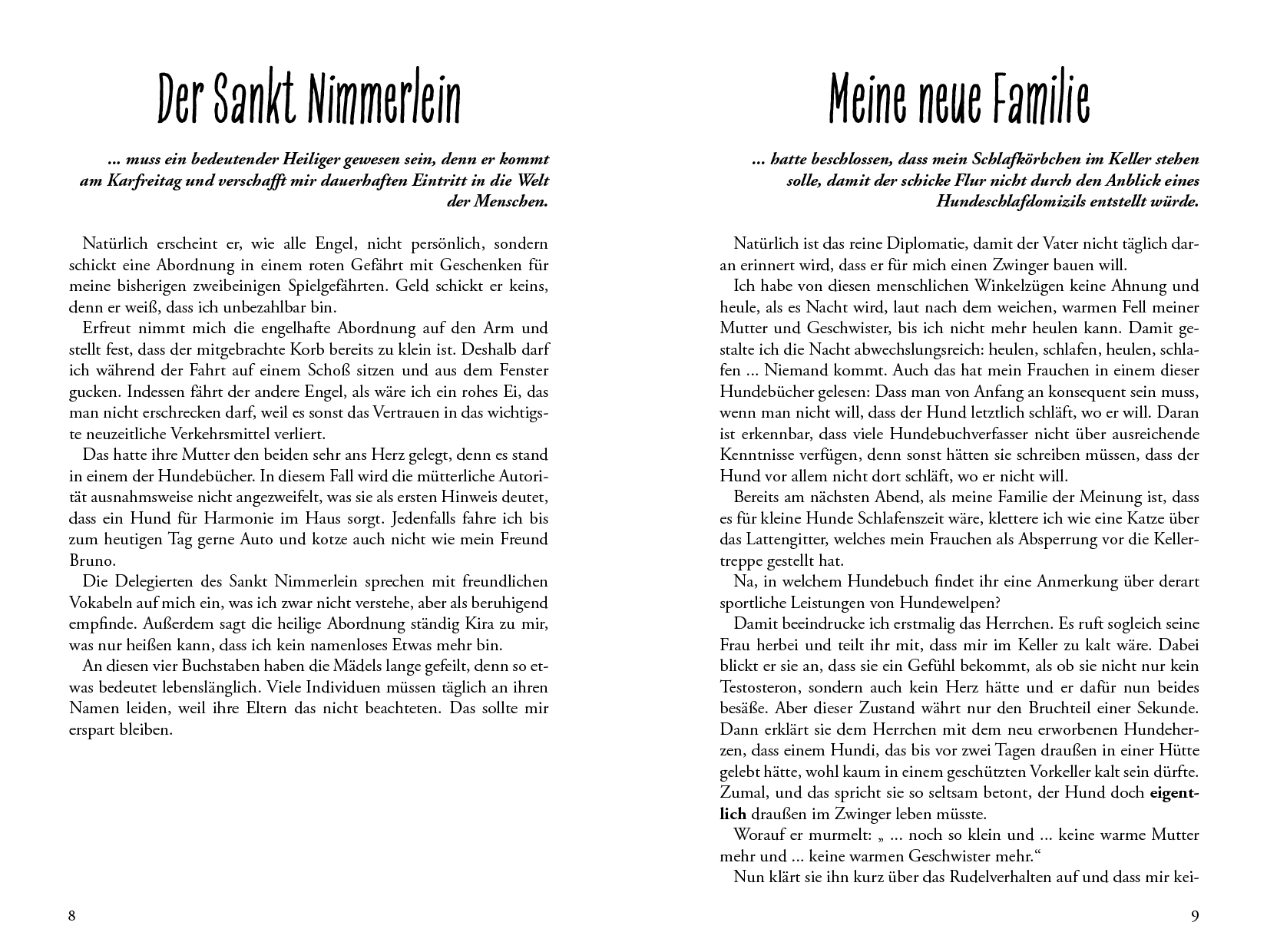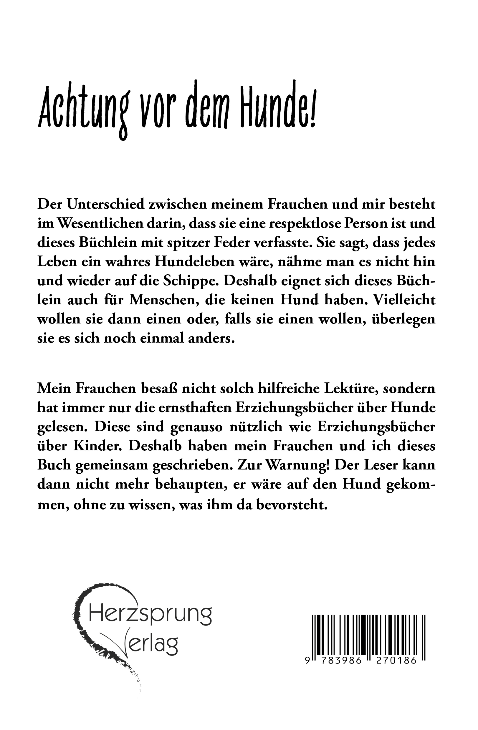 Der Unterschied zwischen meinem Frauchen und mir besteht im Wesentlichen darin, dass sie eine respektlose Person ist und dieses Büchlein mit spitzer Feder verfasste. Sie sagt, dass jedes Leben ein wahres Hundeleben wäre, nähme man es nicht hin und wieder auf die Schippe. Deshalb eignet sich dieses Büchlein auch für Menschen, die keinen Hund haben. Vielleicht wollen sie dann einen oder, falls sie einen wollen, überlegen sie es sich noch einmal anders. Mein Frauchen besaß nicht solch hilfreiche Lektüre, sondern hat immer nur die ernsthaften Erziehungsbücher über Hunde gelesen. Diese sind genauso nützlich wie Erziehungsbücher über Kinder. Deshalb haben mein Frauchen und ich dieses Buch gemeinsam geschrieben. Zur Warnung! Der Leser kann dann nicht mehr behaupten, er wäre auf den Hund gekommen, ohne zu wissen, was ihm da bevorsteht.