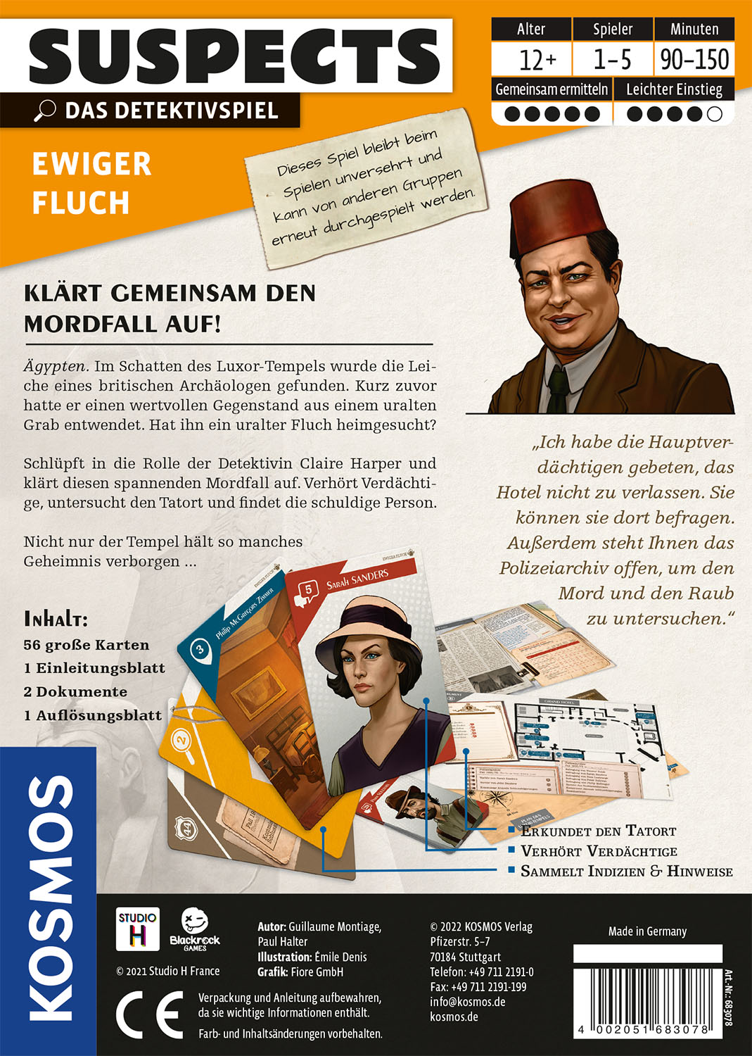 Ein Detektivspiel mit einfachen Regeln. Hinweise sammeln, Verdächte befragen oder den Tatort untersuchen - gemeinsam ermitteln und den Fall lösen. Für 1-5 Krimi-Fans ab 12 Jahren. Die Suspects Fälle erlebt ihr am besten als einmaliges Krimispiel-Erlebnis. Das Spielmaterial bleibt jedoch intakt, sodass ihr die Spiele weitergeben könnt. Ideal als Partyspiel, Eventspiel für einen spannenden Spieleabend. Dank kompaktem Format ein perfektes Geburtstagsgeschenk oder als Reise- und Mitbringspiel. Ein neuer Fall für Detektivin Claire Harper - diesmal in Ägypten, dem Land der Pharaonen und Pyramiden! Nahe des berühmten Luxor-Tempels wird die Leiche eines britischen Archäologen gefunden. Hat der Mord vielleicht etwas mit seinem letzten Fund zu tun? Feinde unter Freunden und Kollegen sind nicht bekannt und die Polizei tappt im Dunkeln. Jetzt sind die 1-5 Spielerinnen und Spieler ab 12 Jahren gefragt! Sie schlüpfen in die Rolle der Detektivin und ermitteln gemeinsam. Karte für Karte untersuchen sie dafür den Tatort, verhören Verdächtige und sammeln Beweise. Dabei kommen sie dem einen oder anderen Geheimnis auf die Spur. Einfache Regeln und tolles Setting für einen Spieleabend.