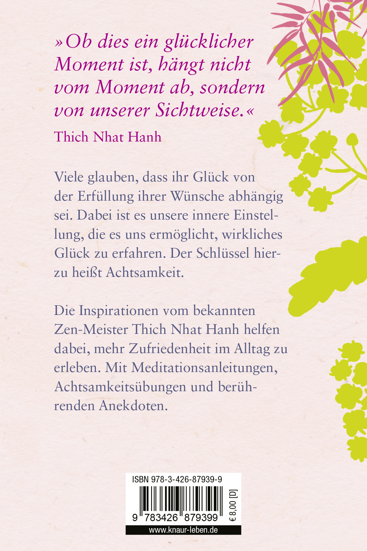 In diesem liebevoll illustrierten Geschenkbuch helfen die ausgewählten Inspirationen des bekannten Zen-Meisters Thich Nhat Hanh dabei, unsere Achtsamkeit und Präsenz zu stärken. Denn es ist unsere innere Einstellung, die darüber entscheidet, ob wir das Glück erkennen und spüren. Konkrete und leicht anwendbare Achtsamkeitsübungen, Meditationsanleitungen und berührende Geschichten aus dem Leben des beliebten Lehrers machen dieses Buch zu einem besonderen Begleiter für den achtsamen Alltag. Ein ideales Geschenk - vierfarbig mit Illustrationen und Lesebändchen.