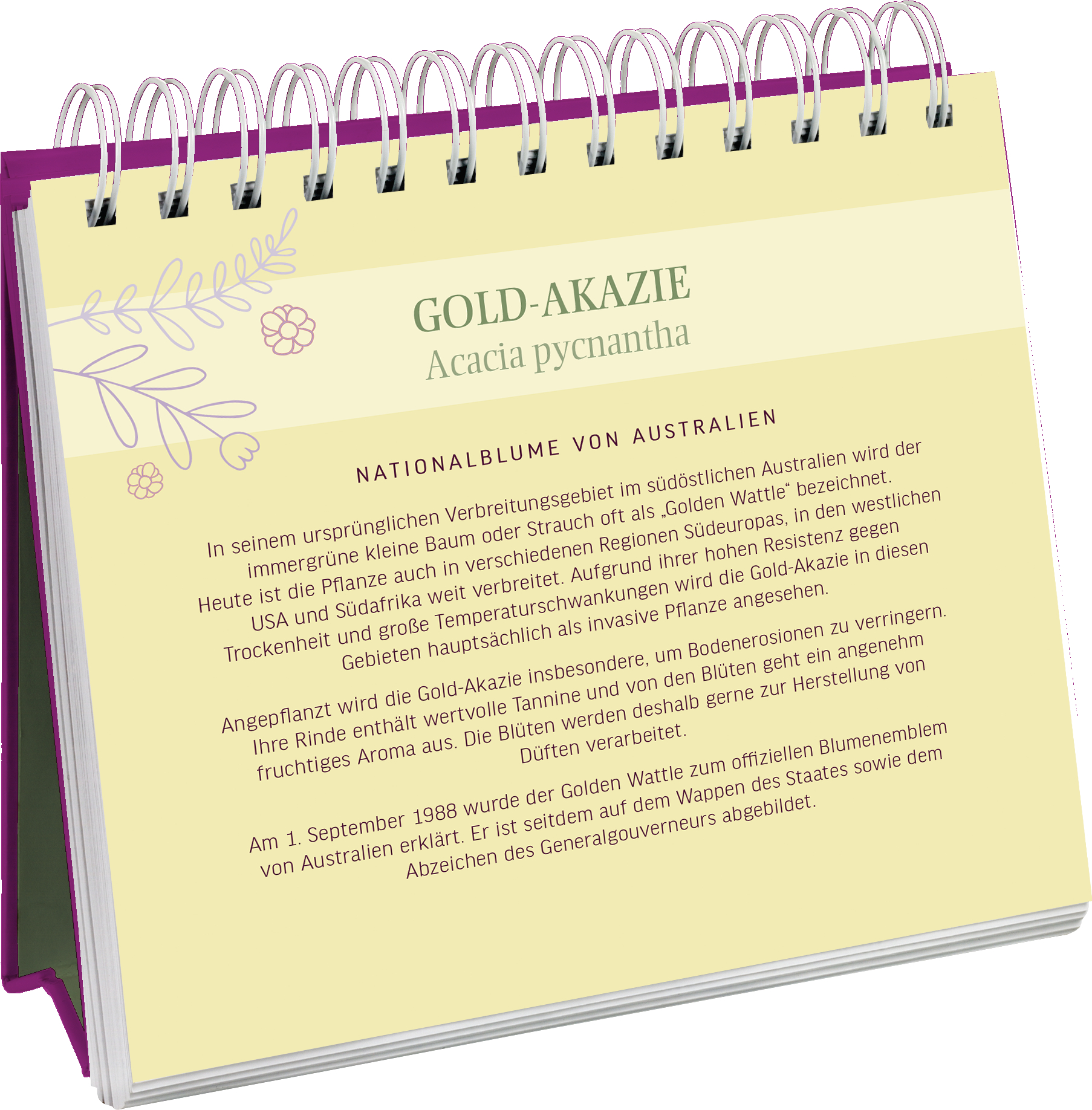 80 offizielle und inoffizielle Landesblumen werden in dem Aufsteller vorgestellt. Zusätzlich zu den leuchtenden Fotos enthält er auch interessante Fakten rund um die heimischen und exotischen Blumen. Die poetischen Sprüche und Zitate machen den Spiralaufsteller zu einem zauberhaften Geschenk.