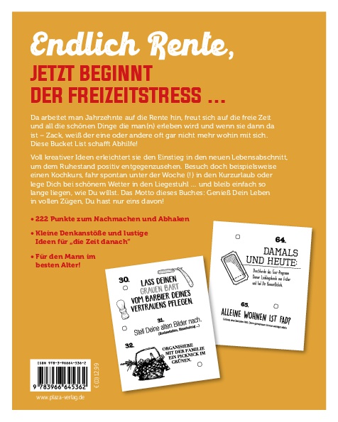 Endlich Rente, jetzt beginnt der Freizeitstress!Da arbeitet man Jahrzehnte auf die Rente hin, freut sich auf die freie Zeit und all die schönen Dinge die man(n) erledigen wird und wenn sie dann da ist - zack!, weiß der eine oder andere oft gar nicht mehr wohin mit sich. Diese Bucket List schafft Abhilfe! Das perfekte Geschenk zum Start in den neuen Lebensabschnitt; voll kreativer Ideen, um den Einstieg zu erleichtern und dem Ruhestand positiv entgegenzusehen. Besuchen Sie doch beispielsweise einen Kochkurs, fahren spontan ein paar Tage weg oder legen sich bei schönem Wetter in den Liegestuhl und bleiben einfach so lange sitzen, wie Sie wollen. Das Motto dieses Buches: Genießen Sie Ihr Leben in vollen Zügen, Sie haben nur eins davon!Unter 222 Punkten zum Nachmachen und Abhaken findet MANN kleine Denkanstöße und lustige Ideen für "die Zeit danach". Schön gestaltet und humorvoll illustriert, ist dieses Buch ein lustiges Mitbringsel, das garantiert Freude bereitet - kurzum, das ideale Geschenk zum Rentenbeginn. Ob als Abschiedsgeschenk von Arbeitskollegen, für den besten Freund oder für den Vater oder Großvater: Überraschende Facts, originelle Ideen, kleine Weisheiten und viel Humor helfen ihnen beim Abenteuer Ruhestand. Einfach das perfekte Buch für alle, die demnächst in Rente gehen oder es bereits sind!