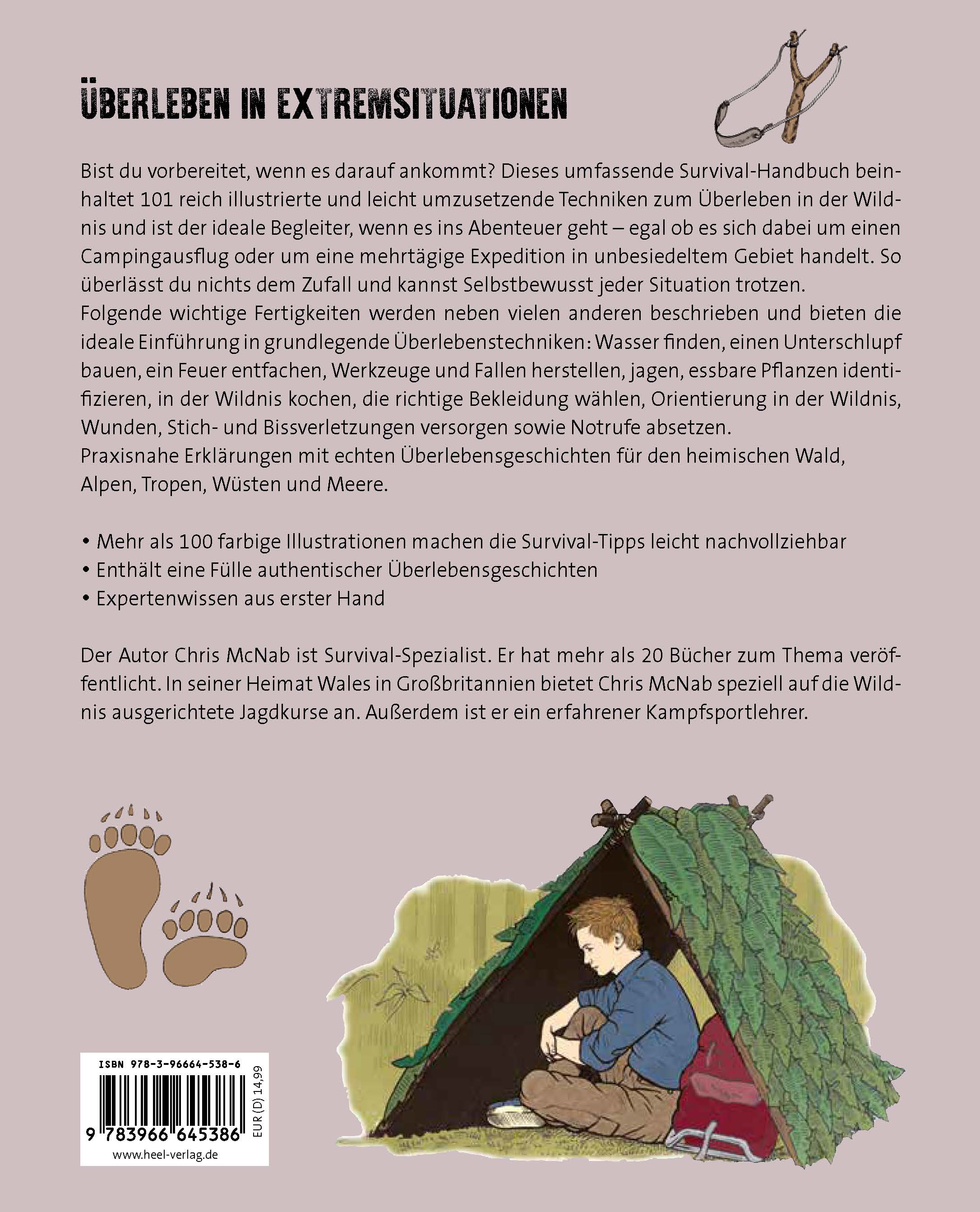 Survival für Anfänger!Sind Sie vorbereitet, wenn es darauf ankommt? Dieses umfassende Survival-Handbuch beinhaltet 101 anschaulich illustrierte und leicht umzusetzende Techniken zum Überleben in der Wildnis und ist der ideale Begleiter, wenn es ins Abenteuer geht - egal ob es sich dabei um einen Campingausflug oder um eine mehrtägige Expedition in unbesiedeltem Gebiet handelt. Lernen Sie Tipp für Tipp, wie Sie sich erfolgreich für den Ernstfall wappnen. Sie erhalten alle erforderlichen Informationen und praxiserprobte Methoden vom kompetenten Survival-Experten für das Überleben fernab von jeglicher Zivilisation und Fremdversorgung. Von der Vorbereitung auf den Notfall, über Wasser finden, Unterschlupf bauen, ein Feuer entfachen, Werkzeuge und Fallen herstellen, Jagen, essbare Pflanzen identifizieren, in der Wildnis kochen, die richtige Bekleidung wählen, die Orientierung in der Wildnis bis hin zu Wunden, Stich- und Bissverletzungen versorgen sowie Notrufe absetzen - dieses Survival-Buch lässt keine Fragen offen! On top gibt es zu vielen Tipps kurze wahre Überlebensgeschichten, die nicht nur informativ sind, sondern auch unterhaltsam und spannend zu lesen! Der Survival-Guide ist eine interessante und abwechslungsreiche Lektüre, ein Buch, das man immer wieder gerne in die Hand nimmt.Gute Kenntnisse über das Überleben in der Natur sind in jeder Lebenslage hilfreich! Gasknappheit, Ukraine-Krieg, Corona-Pandemie, die Flutkatastrophe als Folge der Klimakrise - die Ereignisse in der letzten Zeit haben unser Bewusstsein für Krisenvorsorge verändert und gezeigt, dass die Vorbereitung auf einen Notfall uns alle angeht! Viele Menschen haben Sorgen, die allgemeine Unsicherheit steigt. Die heutigen Generationen verfügen nicht mehr über das notwendige Wissen und die Fertigkeiten, um in einem Notfall - ohne die Versorgung durch Strom oder Gas - angemessen handeln und überleben zu können. Dies beginnt schon beim Anlegen von Vorräten für den Ernstfall, doch umfasst es auch Fähigkeiten, die Ihnen in diesem Survival-Buch erklärt werden - wie zum Beispiel Wasser zu finden und aufzubereiten, Feuer zu machen und Nahrungsmitteln in der Wildnis zu finden und zuzubereiten - ohne die Versorgung durch die Zivilisation oder Einsatzkräfte. Dieses Buch hilft Ihnen dabei, die Kontrolle über das eigene Leben in einem Notfall zu bewahren und die Versorgung Ihrer Familie zu sichern.- Mehr als 100 farbige Illustrationen machen die Survival-Tipps leicht nachvollziehbar.- Erklärt die erforderlichen Kenntnisse und Fähigkeiten, über die jeder Mensch in diesen schwierigen Zeiten verfügen sollte.- Gibt zahlreiche hilfreiche Tipps, Tricks und wertvolles Hintergrundwissen für den ErnstfallDie perfekte Vorbereitung für den Notfall - werden auch Sie zum Survival-Experten!Der Autor Chris McNab ist Survival-Spezialist. Er hat mehr als 20 Bücher zum Thema veröffentlicht. In seiner Heimat Wales in Großbritannien bietet Chris McNab speziell auf die Wildnis ausgerichtete Jagdkurse an. Außerdem ist er ein erfahrener Kampfsportlehrer.