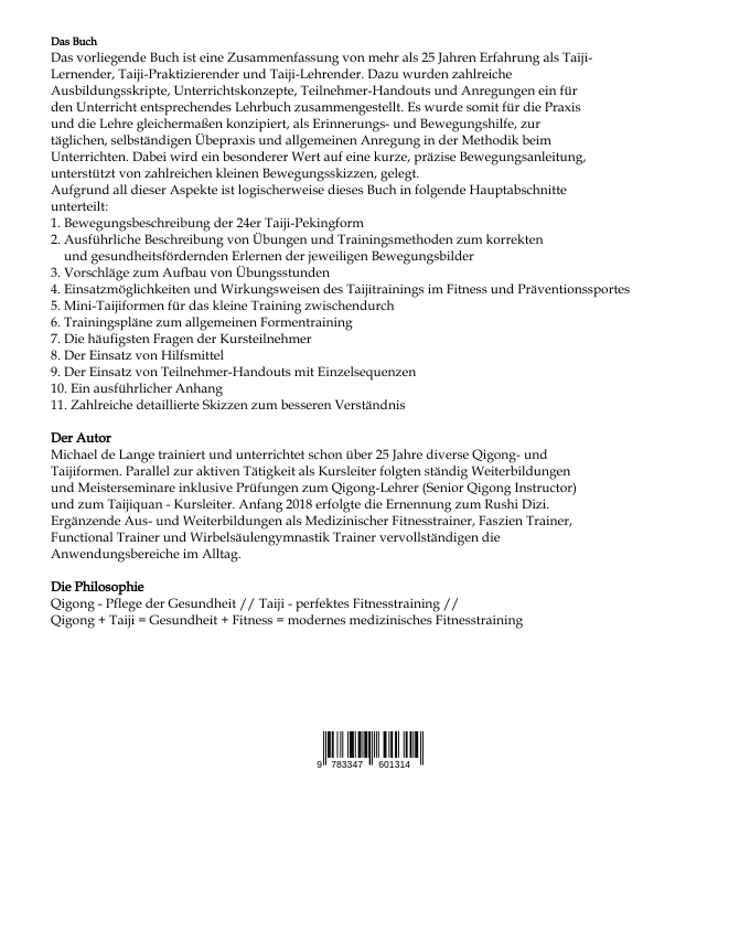 Der Autor: Michael de Lange hatte schon während der langjährigen Tätigkeit als Ingenieur seit 1998 intensiven Kontakt zum Taiji. Daraus entwickelte sich mehr und nach einigen Jahren des Besuches von öffentlichen Kursen startete die Ausbildung 2007 zum Qigongkursleiter. Parallel zur aktiven Tätigkeit als Kursleiter folgten Weiterbildungen und Meisterseminare und schließlich 2013 die erfolgreiche Abschlußprüfung zum Qigong-Lehrer (Senior Qigong Instructor) und in 2014 die erfolgreiche Abschlußprüfung zum Taijiquan-Kursleiter; beide nach den Richtlinien des DYYSG, DDQT, NTQ und der Spitzenverbände der deutschen gesetzlichen Krankenkassen. Anfang 2018 erfolgte die Ernennung zum Rushi Dizi. Ergänzende Weiterbildungen als Medizinischer Fitnesstrainer, Faszientrainer und Functional Trainer vervollständigen die Anwendungsbereiche im Alltag. Die zahlreichen und intensiven Rückmeldungen aller Kursteilnehmer führen bei ihm ungebremst zu täglicher Motivation und Freude, sich dem Praktizieren mit allen Schülern, Freunden und Kollegen zu widmen. Seine Philosophie, die den Schülern vermittelt wird, lautet: Qigong – Erlernen – Praktizieren – Gesundheit bewahren // Taiji – Training – Ein – Leben – Lang // Qigong und Taiji = Gesundheit und Fitness Der Autor ist Mitglied der Deutschen Gesellschaft für Daoyin Yangsheng Gong e. V. und Mitglied im Forum Gesunder Rücken - besser leben e.V.