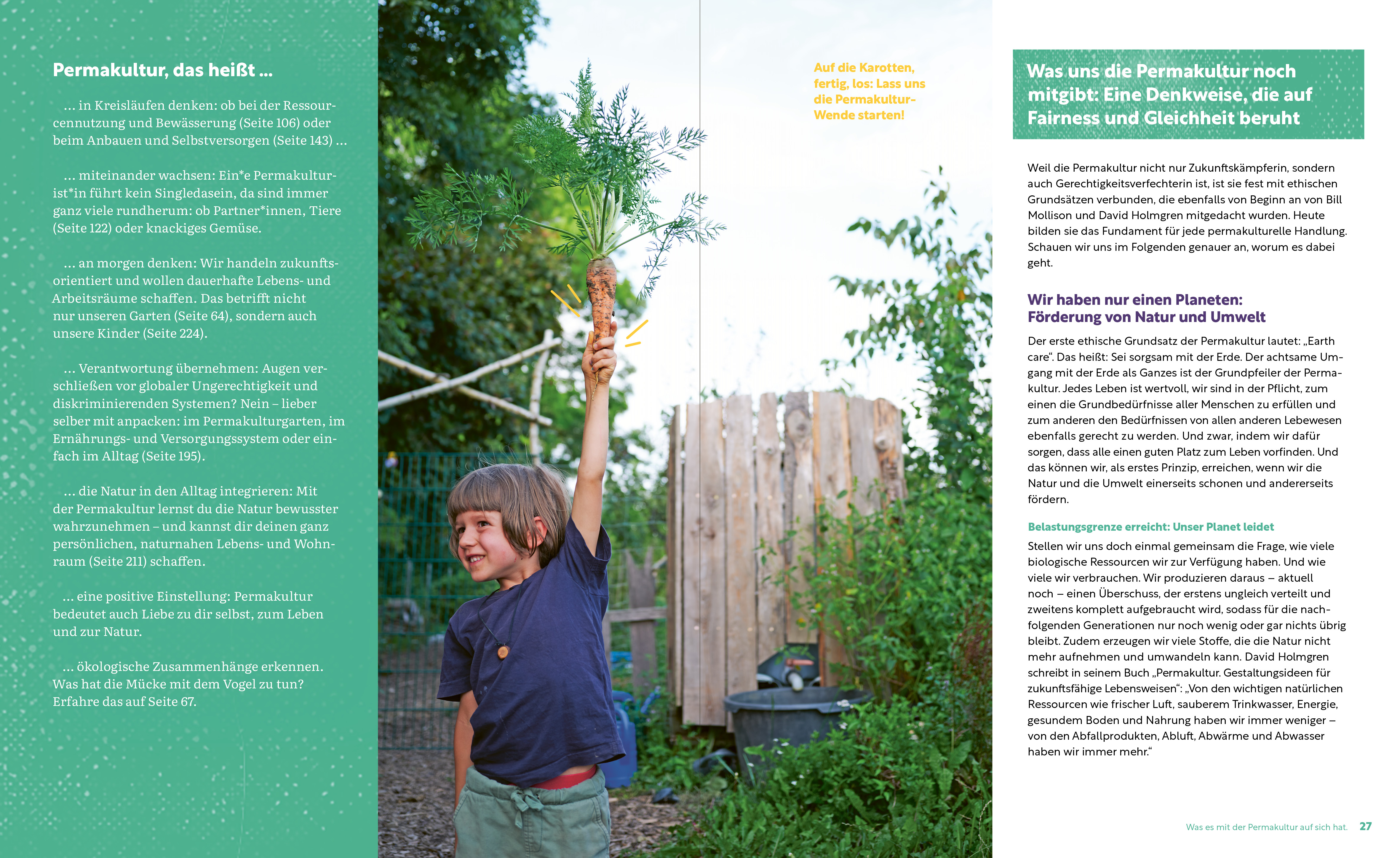 Dieses Buch wird klimapositiv hergestellt, cradle-to-cradle gedruckt und bleibt plastikfrei unverpackt.Lass Permakultur in dein Leben einziehen - und mach die Welt ein bisschen bunter, fairer, regenerativerDu hast keine Lust mehr auf Klimakrise und Ausbeutung, auf Konsumzwang und Verschwendung? Deine Vision ist eine gerechtere Welt, die auf Nachhaltigkeit statt Konkurrenz baut? Good News: Permakultur kann dir den Weg zeigen. Dahinter steckt ein umfassendes System an Strategien, die du quasi überall umsetzen kannst: im Alltag, in der Vorratskammer, in Konsum- und Energiefragen, auf dem Acker oder gemeinsam mit deinen Kindern. Sie liefert uns eine grundlegende Haltung und Werkzeuge dazu, wie wir unsere Umwelt und Gesellschaft im Sinne der Nachhaltigkeit umbauen können - wir alle, Politik und Wirtschaft inklusive. Du willst mehr dazu wissen, wie das alles funktioniert? Tauch ein in die Welt der Permakultur!Unsere Basis? Permakultur! Oder: Der Weg in unsere ZukunftPermakulturgarten, Hügelbeet, Mischkultur: diese Konzepte sind dir vielleicht schon ein Begriff. Aber hast du gewusst, dass die Ideen der Permakultur weit über Gartenbau und Landwirtschaft hinausgehen? Moment, mal von Anfang an: Was ist Permakultur überhaupt? Lass dich von Sabrina Wagner in die permakulturellen Grundsätze einführen. Entdecke ganz viele Möglichkeiten, wie du fruchtbare Ökosysteme, langfristige Kreisläufe und ein gerechtes Miteinander gestalten kannst. Denn: Mit der Permakultur können wir es schaffen, dass wir, unsere Mitlebewesen und alle zukünftigen Generationen hier auf der Erde einen guten Platz zum Leben vorfinden.Permakultur is all around: in Alltag, Küche und Büro. Feiere die Vielfalt, geh auf Entdecker*innenjagd - und denke ganze Systeme neuUnd dann nimmt dich die Autorin mit auf eine Reise durch alle Lebensbereiche. Los geht's unter freiem Himmel: Finde heraus, wie du einen Permakulturgarten anlegen und wie du Permakultur auf dem Balkon und im Gewächshaus umsetzen kannst. Vielleicht hast du Lust, deine Ernte gleich in die Küche zu verfrachten, den Kochlöffel für neue Lieblingsrezepte zu schwingen und zu fermentieren und einzukochen, was das Grünzeug hält. Oder du wirfst einen Blick in dein Büro, dein Badezimmer, deine Werkstatt und überlegst dir, wie du deinen Alltag und dein Konsumverhalten im Sinne der Permakultur gestalten kannst. Und weil gemeinsam alles besser klappt: wie du dich mit anderen zusammenschließen und dich für grüne Lösungen im öffentlichen Raum einsetzen kannst. Denn: Permakultur hat das Potenzial, eine umfassende Wende in Richtung Nachhaltigkeit und Gerechtigkeit anzustoßen. Bist du dabei?- Ziehen wir die Permakulturkreise weiter: Du denkst, in der Permakultur geht es um Garten, Mischkulturen und Nützlinge? Hier geht es noch so viel weiter darüber hinaus: Finde heraus, wie du Permakultur in dein gesamtes Leben einbinden kannst - und so für eine lebenswerte und gerechtere Zukunft sorgen kannst.- Think Permakultur: Egal, ob du deine Gemüsebeete permakulturell gestaltest, deine Ernteüberschüsse mit anderen teilst, reparierst, flickst, backst oder Ökostrom beziehst: Es gibt so viele Möglichkeiten, wie du dein Leben naturnaher und umweltbewusster ausrichten kannst.- The time for action is now: Unser Planet ist mit vielen ökologischen Krisen konfrontiert - unsere Zukunft steht auf dem Spiel. Höchste Zeit, dass wir zukunftsfähig denken und handeln: wir, die Politik und die Wirtschaft. Permakultur kann uns den Weg weisen.