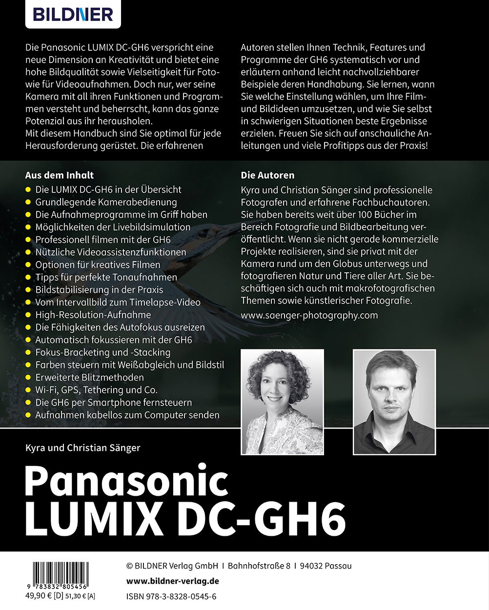 Mit diesem Handbuch sind Sie optimal für jede fotografische Herausforderung gerüstet. Die erfahrenen Autoren stellen Ihnen systematisch die technischen Details der GH6 vor und erläutern anhand anschaulicher Beispiele deren Handhabung. Sie lernen, wann Sie welche Einstellung verwenden, um Ihre Film- und Bildidee umzusetzen, und wie Sie selbst in schwierigen Situationen beste Ergebnisse erzielen. Freuen Sie sich auf gut nachvollziehbare Anleitungen und viele hilfreiche Profitipps aus der Praxis!