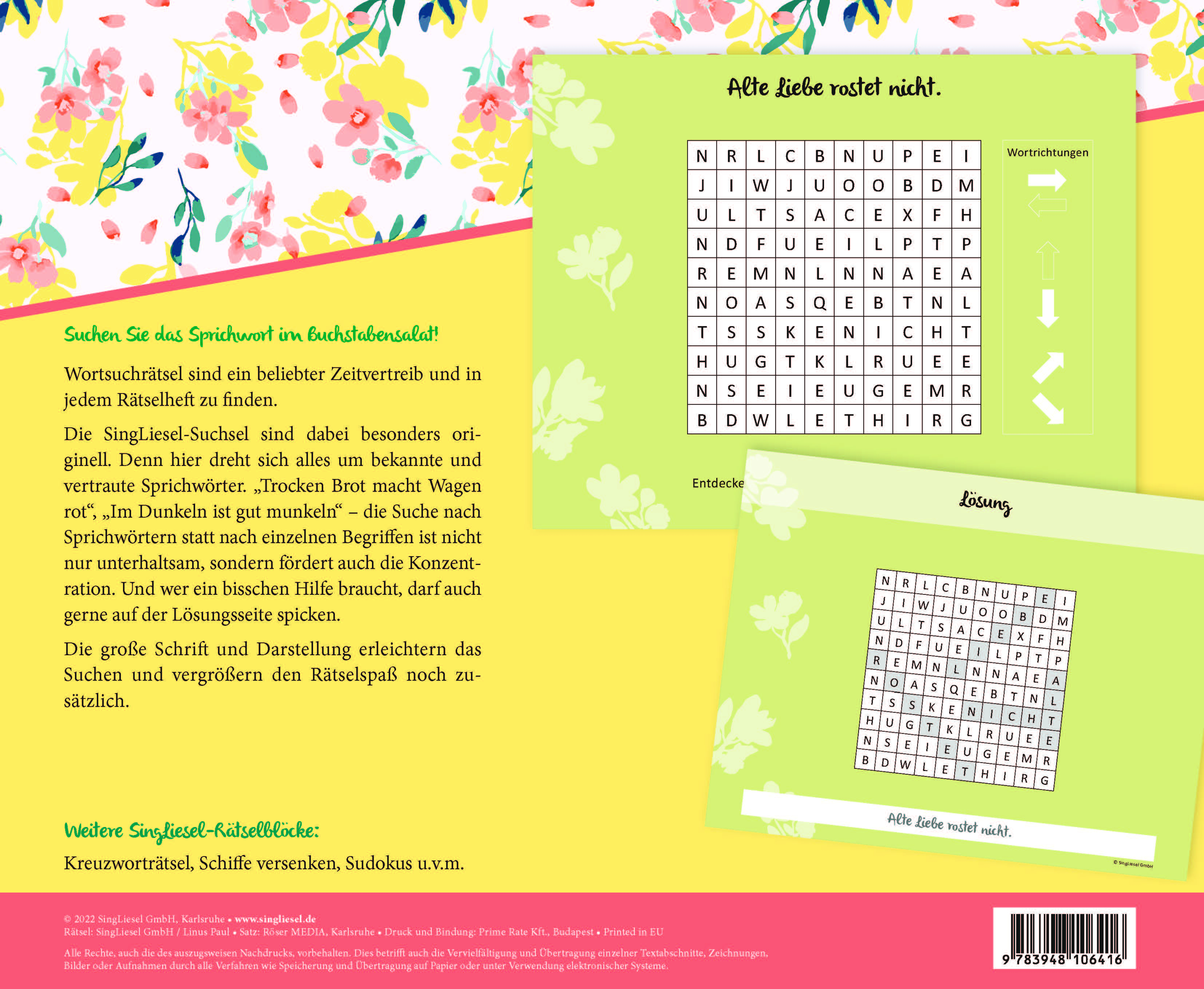 Wortsuchrätsel sind ein beliebter Zeitvertreib und in jedem Rätselheft zu finden.Die SingLiesel-Suchsel sind dabei besonders originell. Denn hier dreht sich alles um bekannte und vertraute Sprichwörter. "Trocken Brot macht Wagen rot", "Im Dunkeln ist gut munkeln" - die Suche nach Sprichwörtern statt nach einzelnen Begriffen ist nicht nur unterhaltsam, sondern fördert auch die Konzentration. Und wer ein bisschen Hilfe braucht, darf auch gerne auf der Lösungsseite spicken. Die große Schrift und Darstellung erleichtern das Suchen und vergrößern den Rätselspaß noch zusätzlich.Die SingLiesel-Rätselblöcke für Senioren sind- im großzügigen XXL-Format gut auszufüllen- in großer Schrift leicht lesbar- knifflig und doch schnell zu lösen für ein garantiertes Erfolgserlebnis- von Experten für Senioren ausgewählt und getestet.Weitere SingLiesel-Rätselblöcke: Kreuzworträtsel, Schiffe versenken, Sudokus u.v.m.