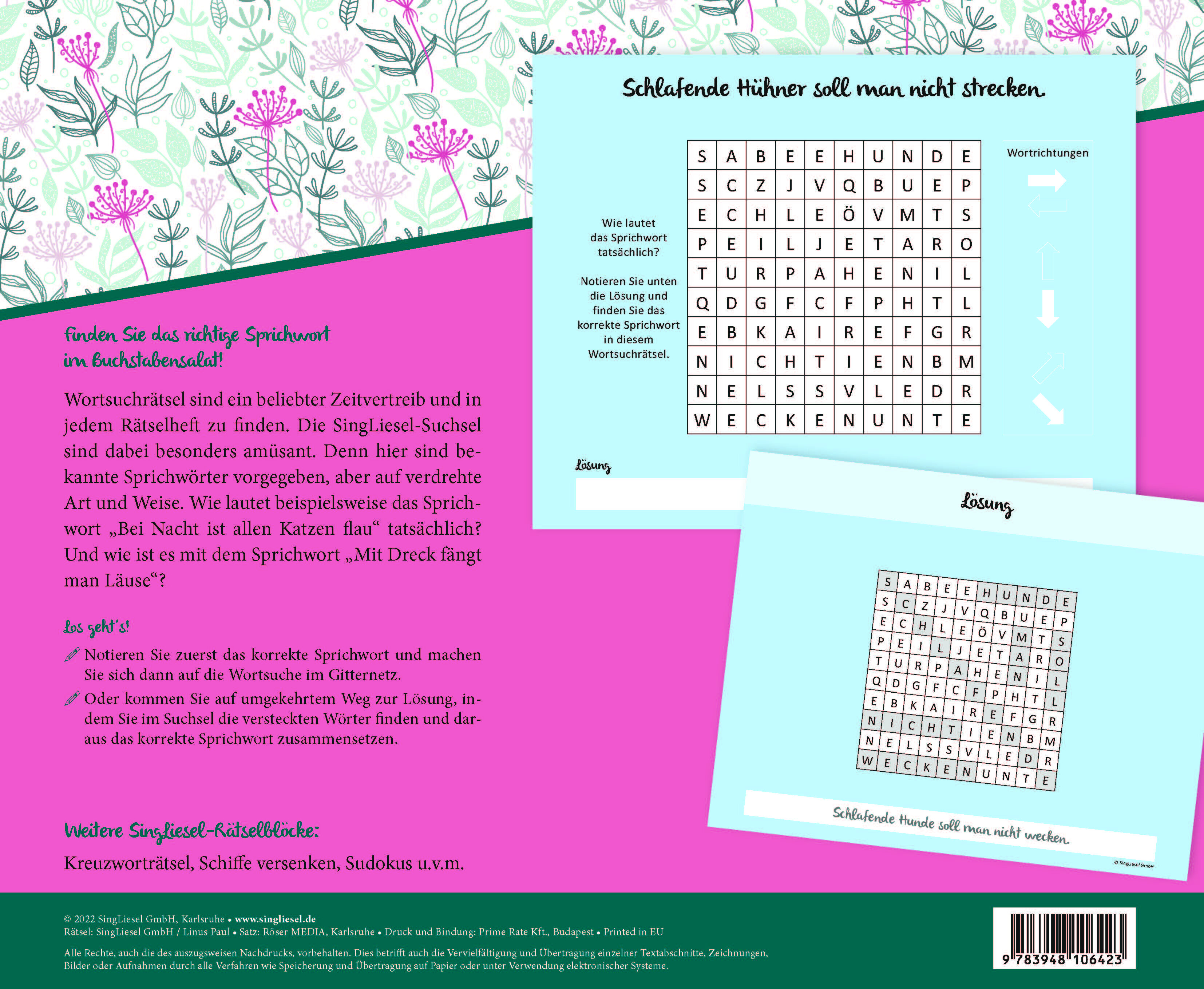 Wortsuchrätsel sind immer noch ein beliebter Zeitvertreib und aus keinem Rätselheft wegzudenken!Die SingLiesel-Suchsel sind dabei besonders. Denn hier alles dreht sich alles um die beliebtesten und vertrautesten Sprichwörter:Hier sind bekannte Sprichwörter vorgegeben - aber auf verdrehte Art und Weise. Wie lautet beispielsweise das Sprichwort "Ausnahmen brechen die Regel" tatsächlich? Notieren Sie zuerst das korrekte Sprichwort und machen Sie sich dann auf die Wortsuche im Gitternetz. Oder kommen Sie auf umgekehrtem Weg zur Lösung, indem Sie im Suchsel die versteckten Wörter finden und daraus das Sprichwort zusammensetzen.Auf unterhaltsameWeise werden Gedächtnis und Konzentration gefördert.