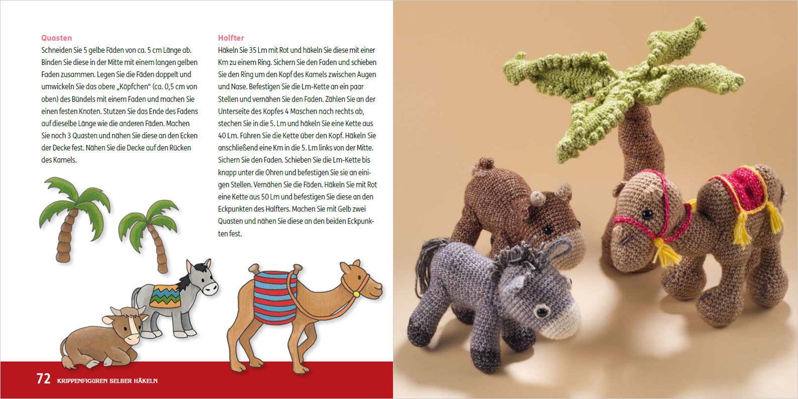Eine komplette Weihnachtskrippe inklusive Tieren, Stern und Palme. Mit kleiner Häkelschule