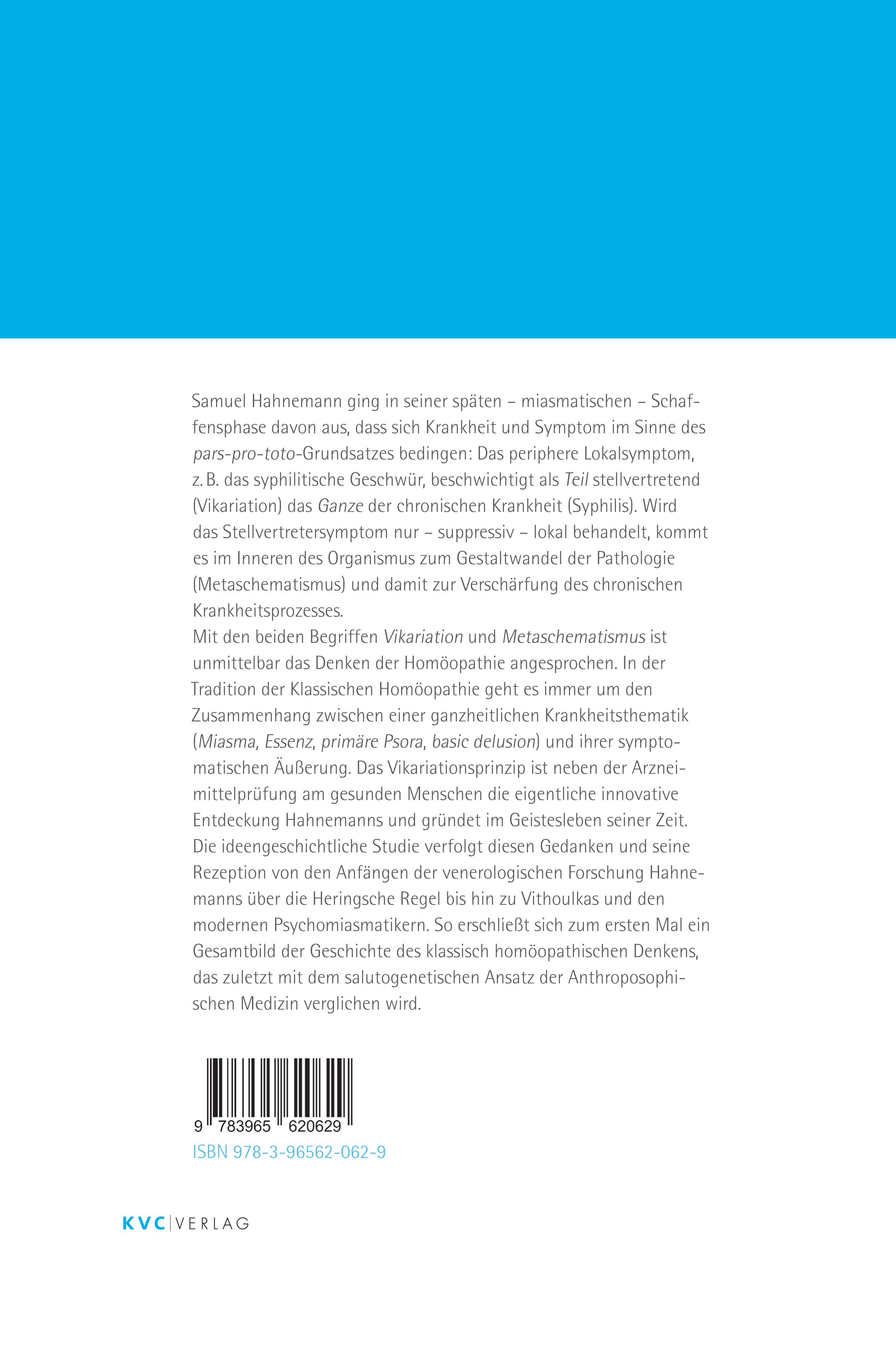 Samuel Hahnemann ging in seiner späten - miasmatischen - Schaffensphase davon aus, dass sich Krankheit und Symptom im Sinne des pars-pro-toto-Grundsatzes bedingen: Das periphere Lokalsymptom, z. B. das syphilitische Geschwür, beschwichtigt als Teil stellvertretend (Vikariation) das Ganze der chronischen Krankheit (Syphilis). Wird das Stellvertretersymptom nur - suppressiv - lokal behandelt, kommt es im Inneren des Organismus zum Gestaltwandel der Pathologie (Metaschematismus) und damit zur Verschärfung des chronischen Krankheitsprozesses.Mit den beiden Begriffen Vikariation und Metaschematismus ist unmittelbar das Denken der Homöopathie angesprochen. In der Tradition der Klassischen Homöopathie geht es immer um den Zusammenhang zwischen einer ganzheitlichen Krankheitsthematik (Miasma, Essenz, primäre Psora, basic delusion) und ihrer symptomatischen Äußerung. Das Vikariationsprinzip ist neben der Arzneimittelprüfung am gesunden Menschen die eigentliche innovative Entdeckung Hahnemanns und gründet im Geistesleben seiner Zeit.Die ideengeschichtliche Studie verfolgt diesen Gedanken und seine Rezeption von den Anfängen der venerologischen Forschung Hahnemanns über die Heringsche Regel bis hin zu Vithoulkas und den modernen Psychomiasmatikern. So erschließt sich zum ersten Mal ein Gesamtbild der Geschichte des klassisch homöopathischen Denkens, das zuletzt mit dem salutogenetischen Ansatz der Anthroposophischen Medizin verglichen wird.