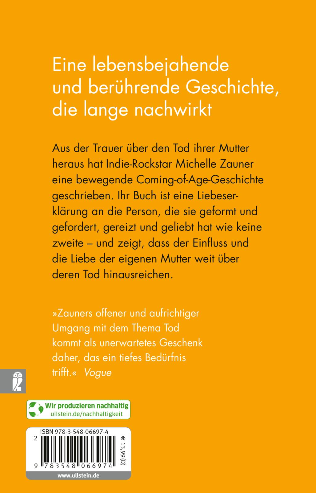 | Schlagworte | Essen • Identität • Indiemusik • Japanese Breakfast • Kochen • Kochen, Essen und Trinken • koreanische Küche • Musik • Mutter • Mutterliebe • New York Times Bestseller • Südkorea • Trinken • USA • Verlust • Verlust der Mutter |