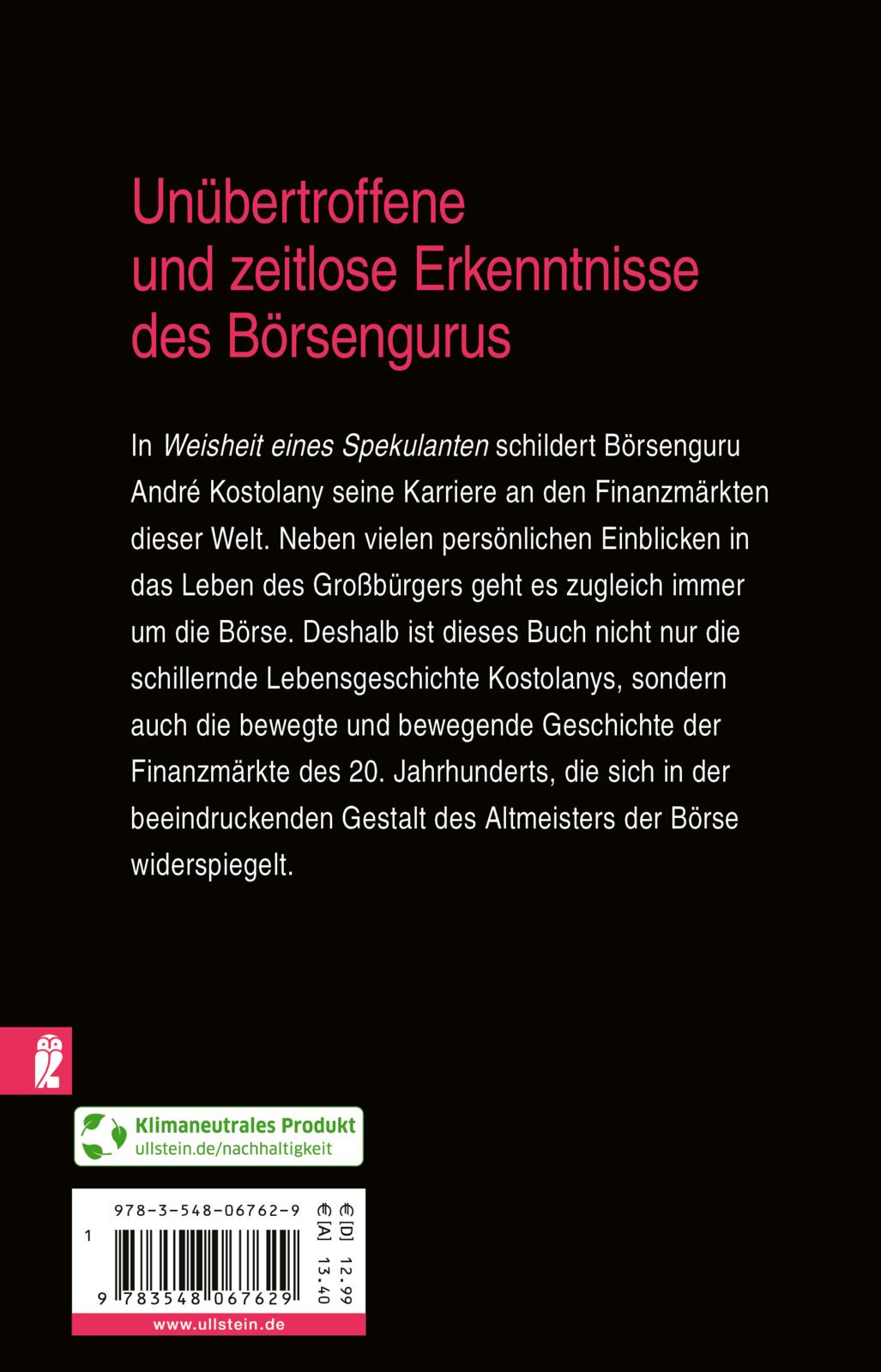 In Weisheit eines Spekulanten schildert Börsenguru André Kostolany seine Karriere an den Finanzmärkten dieser Welt. Obwohl viele sehr persönliche Einblicke in das Leben des Großbürgers vermittelt werden, geht es doch zugleich auch immer um die Börse. Deshalb ist dieses Buch nicht nur die schillernde Lebensgeschichte Kostolanys, sondern auch die bewegte und bewegende Geschichte der Finanzmärkte des 20. Jahrhunderts, die sich in der beeindruckenden Gestalt des Altmeisters der Börse widerspiegelt.
