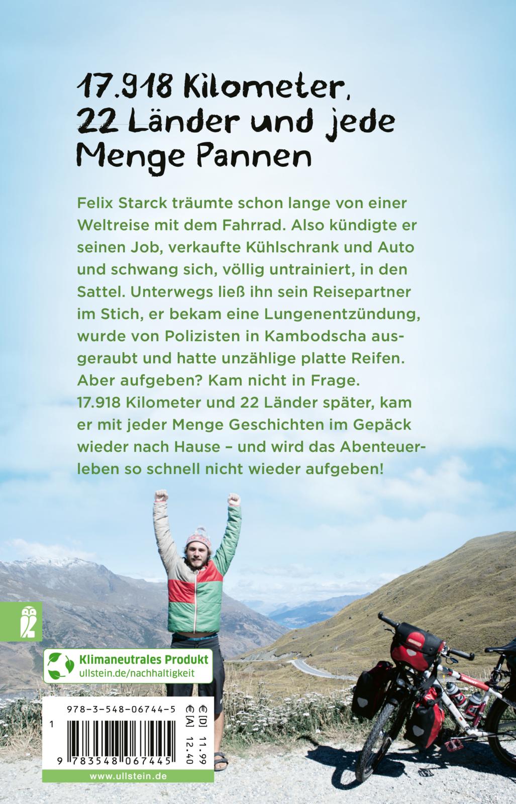 Felix Starck träumte schon lange von einer Weltreise mit dem Fahrrad. Also kündigte er seinen Job, verkaufte Kühlschrank und Auto und schwang sich, völlig untrainiert, in den Sattel. Unterwegs ließ ihn sein Reisepartner im Stich, er bekam eine Lungenentzündung, wurde von Polizisten in Kambodscha ausgeraubt und hatte unzählige platte Reifen. Aber aufgeben? Kam nicht in Frage. 17.918 Kilometer und 22 Länder später, kam er mit jeder Menge Geschichten im Gepäck wieder nach Hause - und wird das Abenteuerleben so schnell nicht wieder aufgeben!