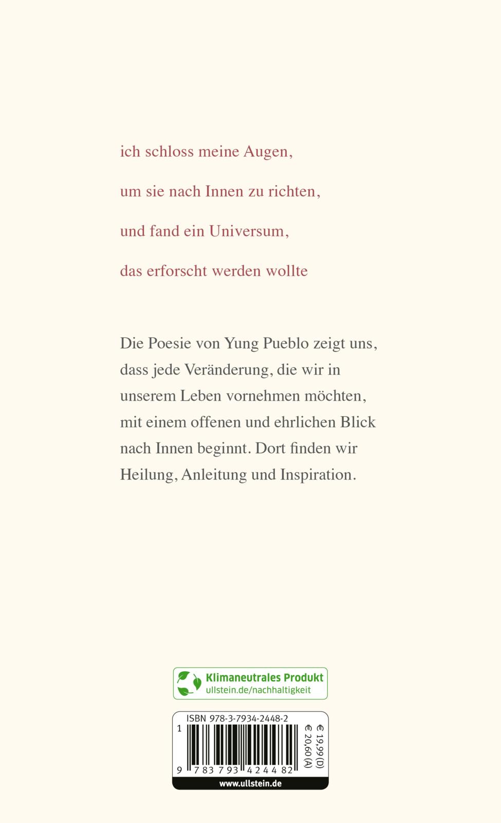 Nach innen ist eine Sammlung von Gedichten, Zitaten und Prosa, die den Weg von der Selbstliebe zur bedingungslosen Liebe, die Kraft des Loslassens und die Weisheit erkundet, die wir erreichen, wenn wir ernsthaft versuchen, uns selbst in all unseren Facetten kennenzulernen. Mit seinen eingängigen Texten führt uns Yung Pueblo eindrücklich vor Augen, dass Heilung, Weiterentwicklung und ein freies, unbeschwertes Leben möglich sind.