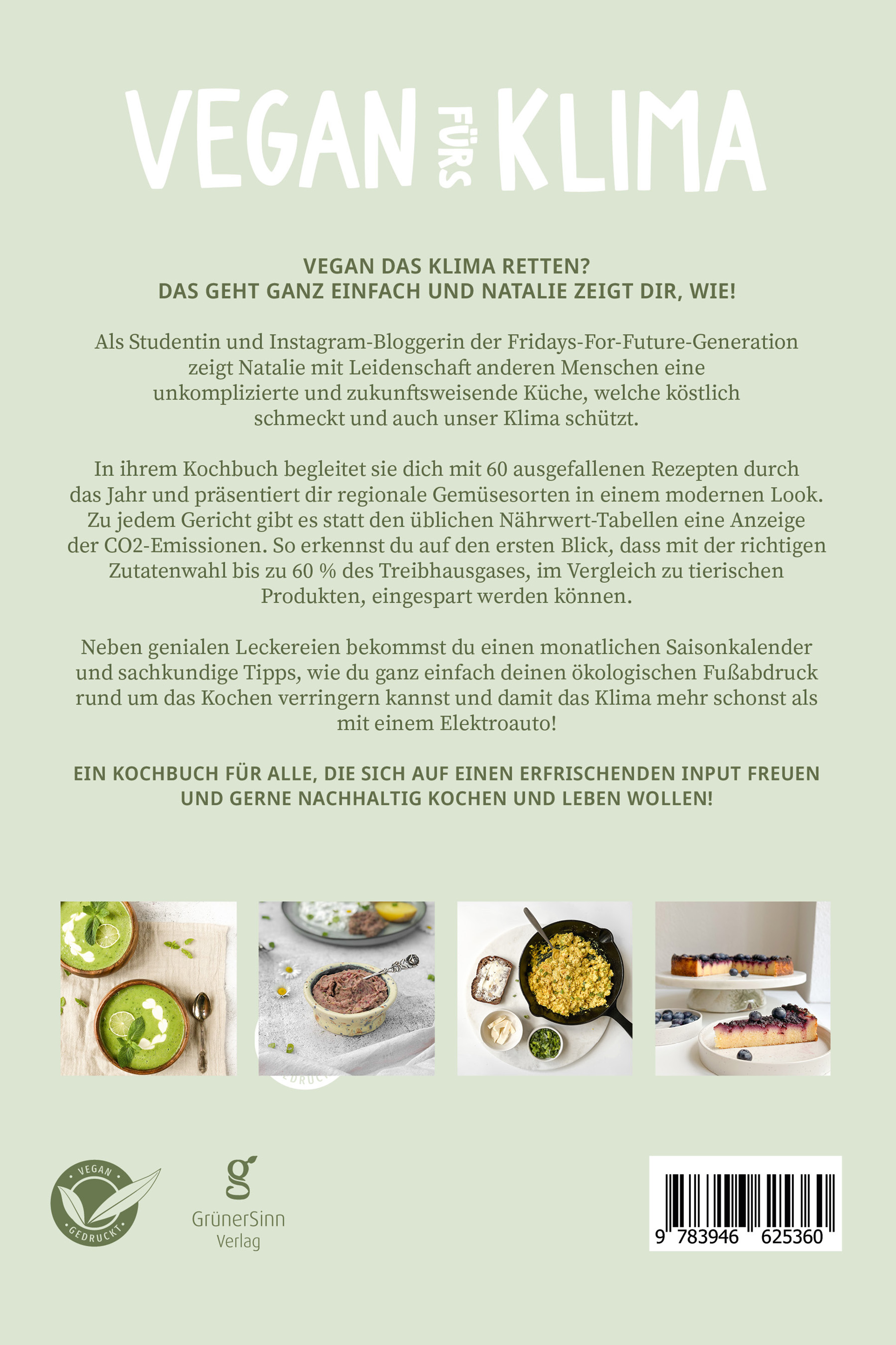Vegan das Klima retten? Das geht ganz einfach und Natalie zeigt dir, wie!Als Studentin und Instagram-Bloggerin der Fridays-For-Future-Generation zeigt Natalie mit Leidenschaft anderen Menschen eine unkomplizierte und zukunftsweisende Küche, welche köstlich schmeckt und auch unser Klima schützt.In ihrem Kochbuch begleitet sie dich mit 60 ausgefallenen Rezepten durch das Jahr und präsentiert dir regionale Gemüsesorten in einem modernen Look. Zu jedem Gericht gibt es statt den üblichen Nährwert-Tabellen eine Anzeige der CO2-Emissionen. So erkennst du auf den ersten Blick, dass mit der richtigen Zutatenwahl bis zu 60 % des Treibhausgases, im Vergleich zu tierischen Produkten, eingespart werden können.Neben genialen Leckereien bekommst du einen monatlichen Saisonkalender und sachkundige Tipps, wie du ganz einfach deinen ökologischen Fußabdruck rund um das Kochen verringern kannst und damit das Klima mehr schonst als mit einem Elektroauto!Ein Kochbuch für alle, die sich auf einen erfrischenden Input freuen und gerne nachhaltig kochen und leben wollen!