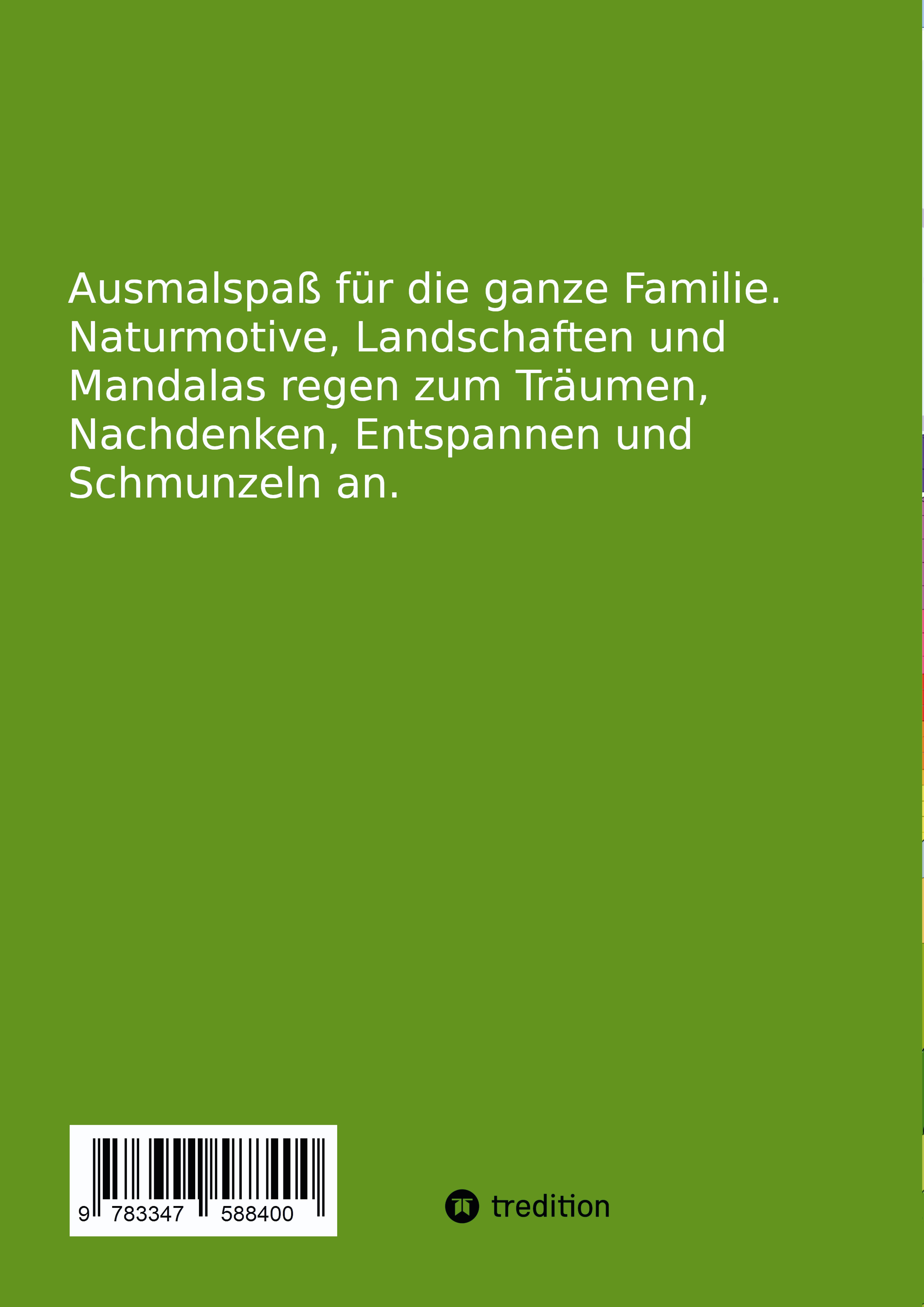 Ein liebevoll gestaltetes Malbuch für Jung und Alt. Es enthält sowohl Landschaftsmotive als auch Tiermotive sowie eigens kreierte Mandalas oder Muster zum Ausmalen. Der Anspruch der Motive reicht von leicht bis schwer, in über 90 Motiven, systematisch arrangiert.