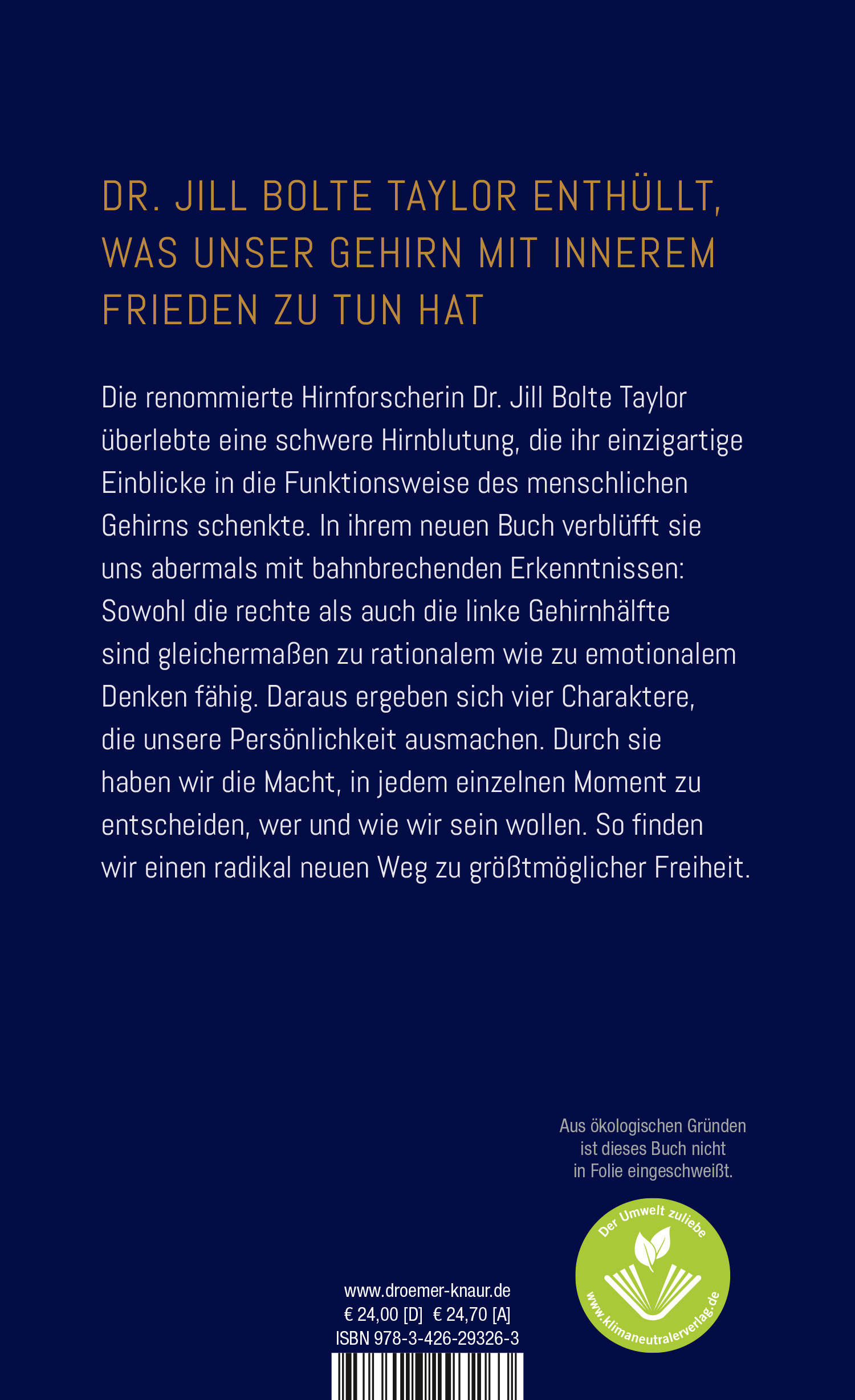 In ihrem ersten Buch Mit einem Schlag berichtete Bolte Taylor von ihrer schweren Hirnblutung und ihrer sich daraus ergebenden einzigartigen Einsicht in die Funktionsweise des menschlichen Gehirns. In den darauffolgenden Jahren forschte sie weiter und kam zu dem Ergebnis: Im Gehirn gibt es vier unterschiedliche Gruppen von Zellen. Diese beeinflussen unsere Wahrnehmung und formen unsere Persönlichkeit. Wie genau diese sogenannten vier Charaktere aussehen, wie wir sie in uns erkennen, wie sie zusammenarbeiten und wie wir sie bewusst steuern können, zeigt uns Jill B. Taylor auf sehr anschauliche Weise.