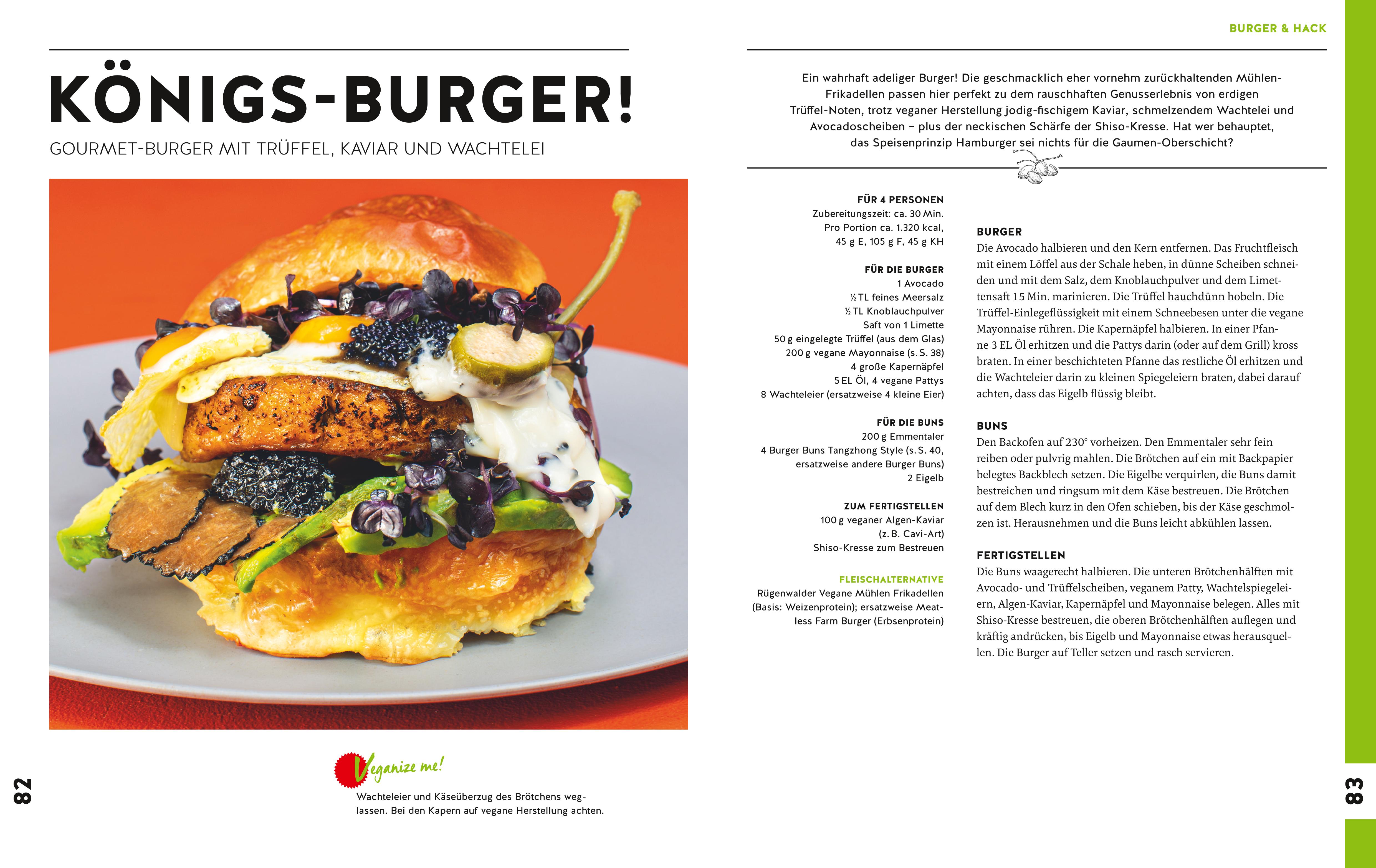 Die Kochrezepte in diesem Buch spiegeln alles wieder, was wir mehrheitlich gerne essen: Herzhaftes wie Schnitzel, Burger, Bolognese, Kebap oder Wraps, bis hin zu Vischstäbchen. Dazu gibt es informative Workshops zu Themen wie „Hack“, „Umami aus Pflanzen“ oder „Raucharoma & Speckersatz“.
