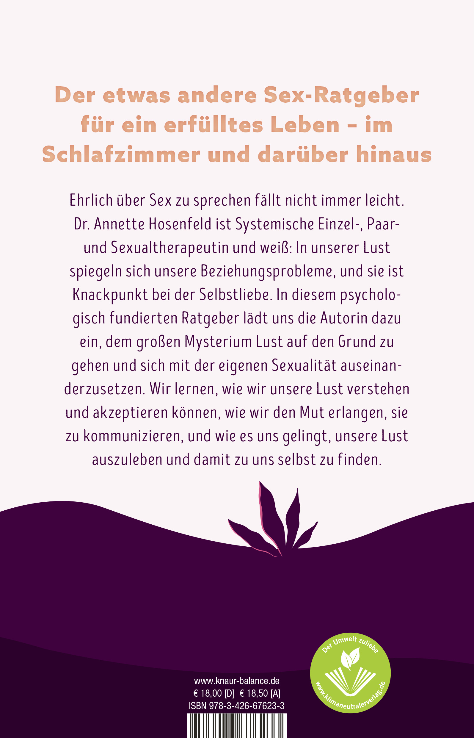 Dr. Dipl.-Psych. Annette Hosenfeld ist systemische Einzel-, Paar- und Sexualtherapeutin und weiß: In unserer Lust spiegeln sich unsere Beziehungsprobleme und sie ist Knackpunkt bei der Selbstliebe. In diesem psychologisch fundierten Ratgeber lädt uns die Autorin dazu ein, sich mit der eigenen Sexualität auseinanderzusetzen und dem großen Mysterium Lust auf den Grund zu gehen. Denn Fakt ist: Wer die eigene Lust verstanden hat und sie auszuleben weiß, hat mehr von sich verstanden.