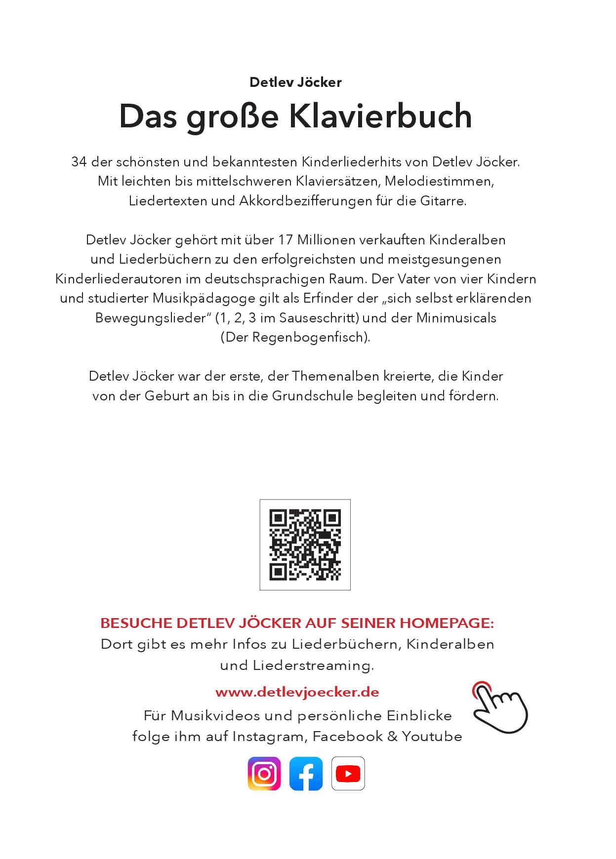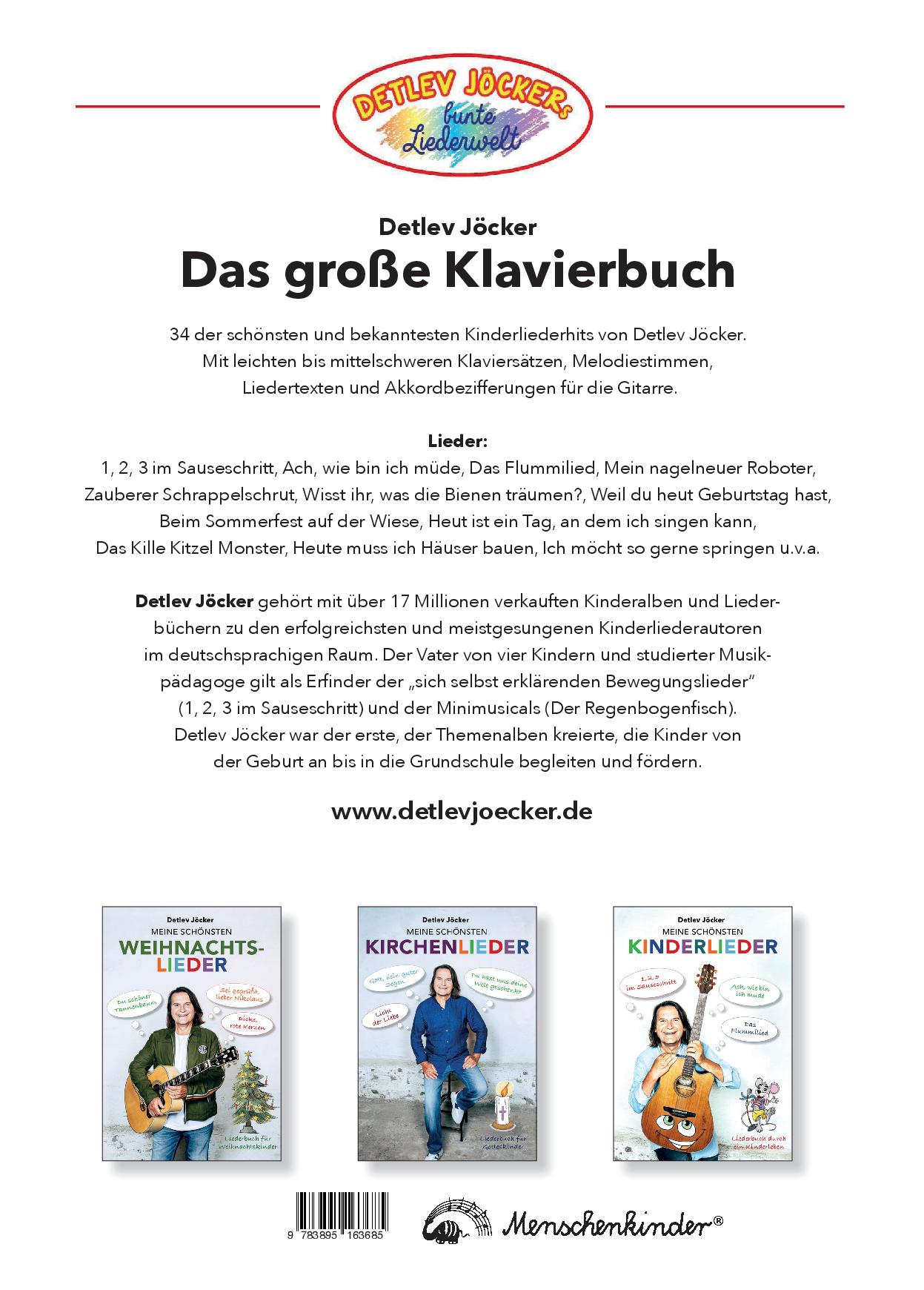 Detlev Jöcker komponierte über 1.300 Kinderlieder, u.a. Klassiker wie "1, 2, 3 im Sauseschritt", "Das Wachmacherlied", "Licht der Liebe" und "Dicke rote Kerzen". Er schuf mit seinen Lern-, Spiel- und Bewegungsliedern ein neues Genre und kreierte u.a. die Gattung der sich selbsterklärenden Bewegungslieder, die alle Bewegungen im Liedertext vorgeben. Detlev Jöcker war der erste, der Themenalben kreierte, die Kinder von der Geburt an bis in die Grundschule begleiten und fördern. Mit über 17 Millionen verkauften Kinderalben und Liederbüchern zählt der Vater von vier Kindern und studierter Musikpädagoge zu den einflussreichsten und meistgesungenen Kinderliederkomponisten dieser Zeit.