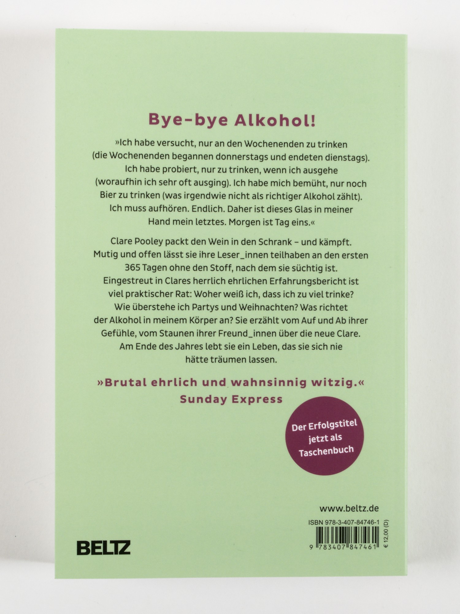 Mittags ein Gläschen mit der Freundin, abends mit dem Partner. Immer mehr Alkohol, um endlich loszulassen vom Stress durch Job und Kinder. Doch die Abstürze häufen sich. Nach einem besonders heftigen Wochenende packt Clare Pooley den Wein in den Schrank, kauft Kisten von alkoholfreiem Bier - und kämpft.Mutig und offen lässt sie ihre Leser_innen teilhaben an den ersten 365 Tagen ohne den Stoff, nach dem sie süchtig ist. Sie erzählt vom Auf und Ab ihrer Gefühle, vom Staunen ihrer Freunde über die neue Clare. Am Ende des Jahres lebt sie ein Leben, das sie sich nie hätte träumen lassen.Eingestreut in Clares herrlich ehrlichen Erfahrungsbericht ist viel praktischer Rat: Woher weiß ich, dass ich zu viel trinke? Wie überstehe ich Partys und Weihnachten? Was richtet der Alkohol in meinem Körper an? Clare Pooleys Humor, ihre positive Haltung und ihre ganz direkte Art machen dieses Buch zum absoluten Lesevergnügen mit ernstem Hintergrund.