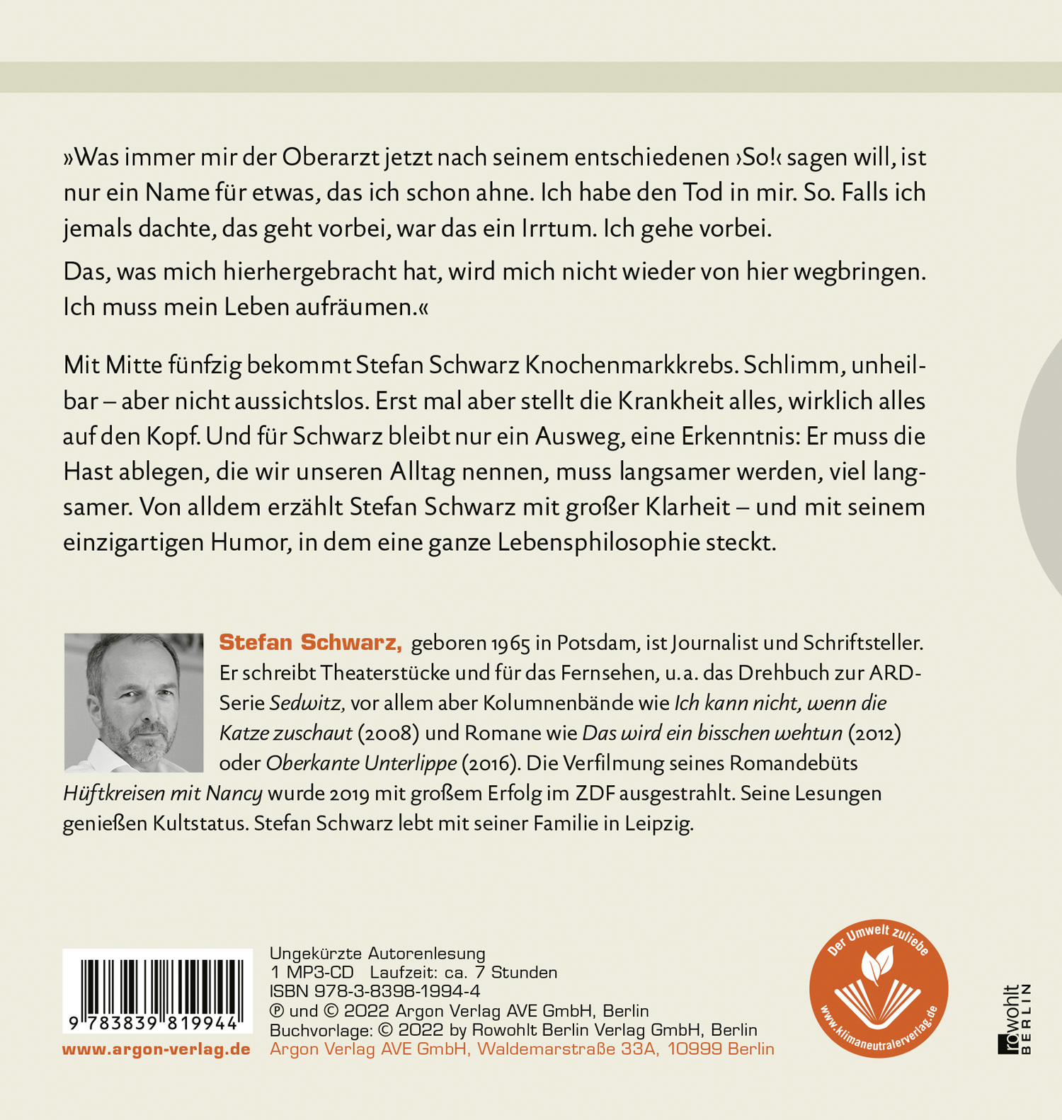 Von all dem erzählt Stefan Schwarz mit seinem einzigartigen Humor, in dem eine ganze Lebensphilosophie steckt. Ruhig, tief und mit wohltuender Selbstironie blickt er auf sein Dasein; innerlich frei und doch um Zukunft kämpfend, schreibt er über das mögliche Ende und das damit verbundene Aufwachen: »Das ist doch der ganze Sinn von Krebs. Dass man aufhört, sich und anderen was vorzumachen, dass man innehält, dass man aufwacht und sich die Augen reibt.«