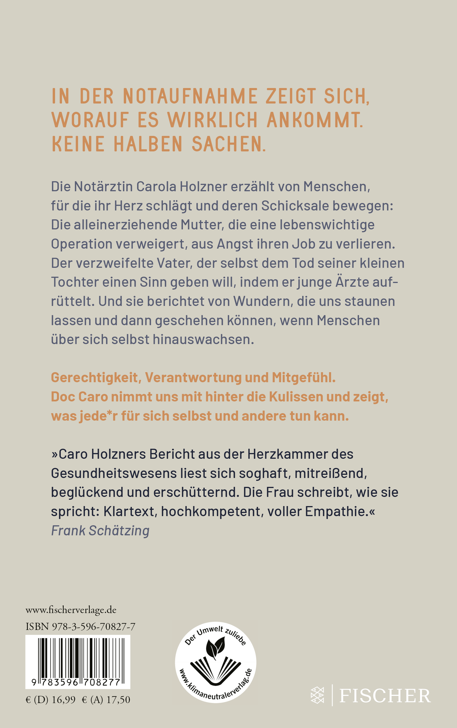 Keine halben Sachen. Die Notärztin Carola Holzner spricht Klartext. Dabei bleibt sie immer sie selbst mit Blick auf die, für die ihr Herz schlägt: ihre Patientinnen und Patienten und deren Schicksale. Sie berichtet von Menschen, die alle auf ihre Art bewegen: Die alleinerziehende Mutter, die eine lebenswichtige Operation verweigert, aus Angst ihren Job zu verlieren. Der verzweifelte Vater, der selbst dem Tod seiner kleinen Tochter einen Sinn geben will, indem er junge Ärzte aufrüttelt.