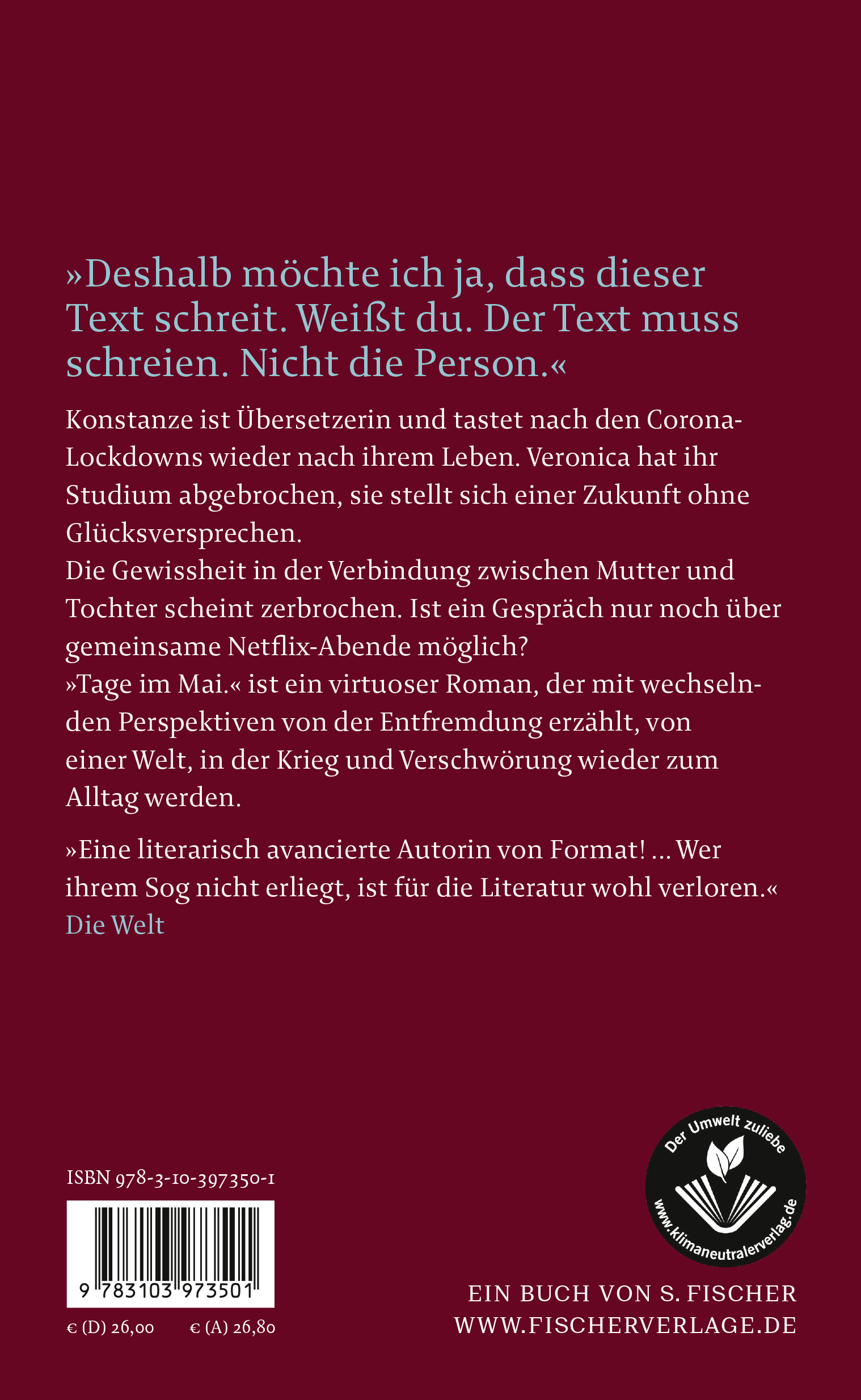 | Schlagworte | Anspruchsvolle Literatur • Corona • Ein Buch von S. Fischer • Feminismus • Generationenkonflikt • Isolation • Kinderlosigkeit • Lebensentwürfe • Mutter-Tochter-Beziehung • TV-Serie • Ukraine |