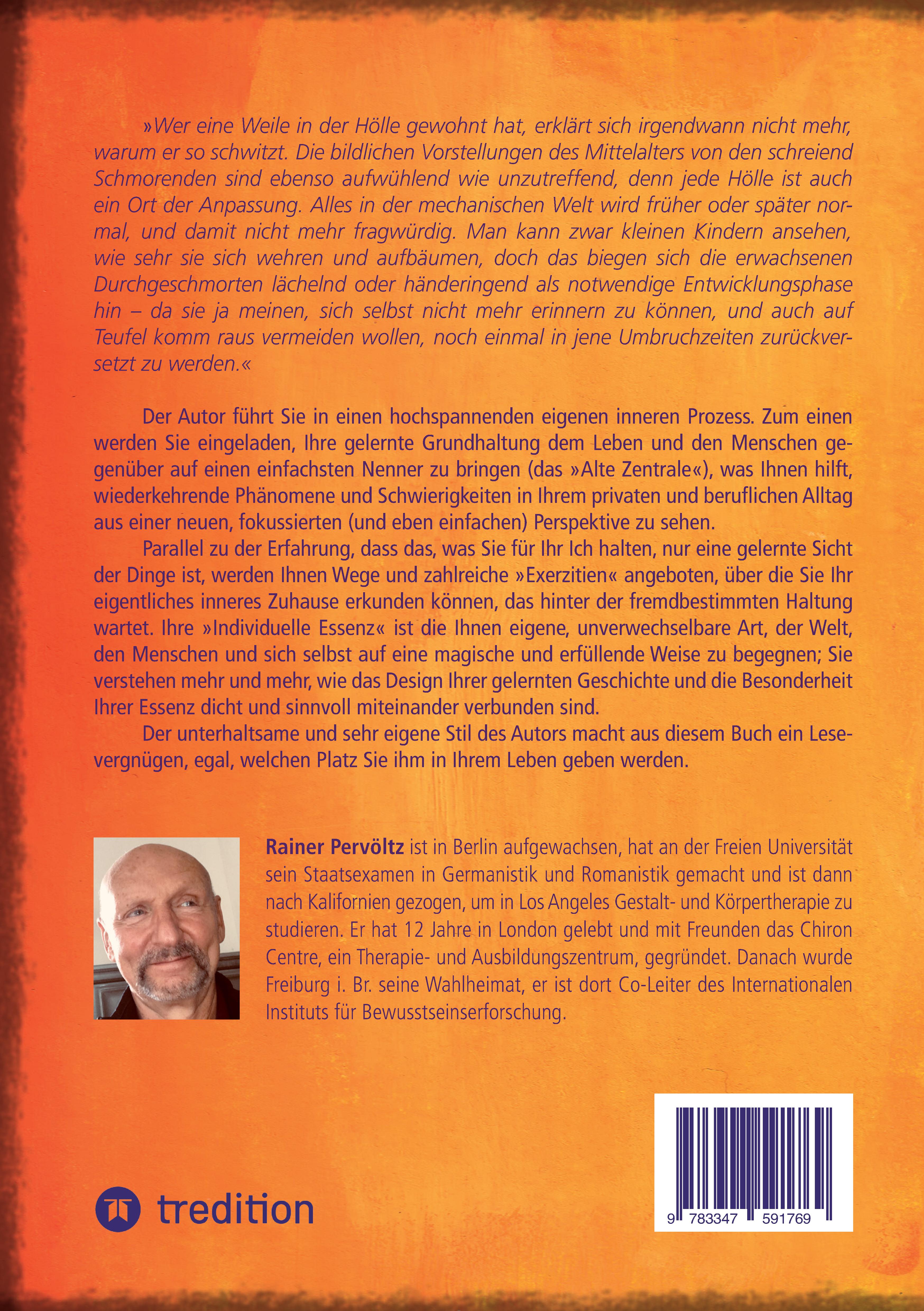 Rainer Pervöltz wurde 1944 geboren und ist in Berlin aufgewachsen. Nach dem Abschluss des Studiums in Germanistik und Romanistik ging er auf eine Einladung hin nach Kalifornien und entdeckte da seinen eigentlichen Beruf: Er fand etliche Lehrer, von denen er Formen der Gestalt- und der Körpertherapie lernte, besonders Jack Lee Rosenberg und Eric Marcus. Hier kam er auch zum ersten Mal in Kontakt mit unterschiedlichen buddhistischen und taoistischen Lehren. Andrew DaPassano wurde sein erster spiritueller Lehrer. In London lernte er von Gerda Boyesen die Biodynamische Körpertherapie, war längere Zeit Ausbilder für Biodynamik und gründete 1983 mit Freunden zusammen das Chiron Centre, ein Therapie- und Ausbildungszentrum. Er lebte zwölf Jahre in London, dann zog es ihn zurück nach Deutschland. Freiburg i. Br. wurde nach Paris, Los Angeles und London seine Wahlheimat. Auch hier entstand mit Freunden ein Ausbildungszentrum, die “Transpersonale Schule für Psychologie und Psychotherapie” und später, 2011, das „Internationale Institut für Bewusstseinserforschung“, ein Psychotherapie- und Ausbildungszentrum mit zwölf erfahrenen Ausbildern aus verschiedenen Ländern Europas und den USA. Er hat viel gelernt von Mantak Chia auf dem Gebiet der taoistischen Energielehre, und Arnold Mindell war einer seiner wichtigsten Lehrer in dem großen Feld der Traumkörperarbeit. Als Therapeut, Supervisor und Lehrer arbeitet Rainer Pervöltz in Deutschland und anderen europäischen Ländern. Er lebt jetzt meistens fröhlich in einem kleinen Dorf in der Nähe von Freiburg. Rainer Pervöltz bietet Ausbildungen und Seminare zur Thematik des „Zentralen“ an. Falls Sie sich dafür interessieren, finden Sie Informationen unter www.bewusstseinserforschung.de und www.pervoeltz.de.