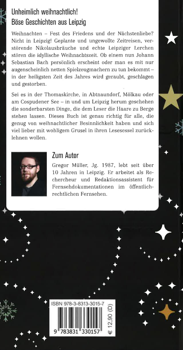 Weihnachten - Fest des Friedens und der Nächstenliebe? Nicht in Leipzig! Geplante und ungewollte Zeitreisen, verstörende Nikolausbräuche und echte Leipziger Lerchen stören die idyllische Weihnachtszeit. Ob einem nun Johann Sebastian Bach persönlich erscheint oder man es mit nur augenscheinlich netten Spielzeugmachern zu tun bekommt - in der heiligsten Zeit des Jahres wird geraubt, geschlagen und gestorben. Sei es in der Thomaskirche, in Abtnaundorf, Mölkau oder am Cospudener See - in und um Leipzig herum geschehen die sonderbarsten Dinge, die dem Leser die Haare zu Berge stehen lassen. Dieses Buch ist genau richtig für alle, die genug von weihnachtlicher Besinnlichkeit haben und sich viel lieber mit wohligem Grusel in ihren Lesesessel zurücklehnen wollen.