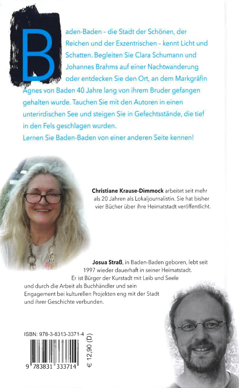 Josua Straß, in Baden-Baden geboren, ist seit 1997 wieder dauerhaft dort wohnend. Er ist Bürger der Kurstadt mit Leib und Seele und durch die Arbeit als Buchhändler und das Engagement bei kulturellen Projekten aufs engste mit der Stadt und ihrer Geschichte verbunden.Christiane Krause-Dimmock arbeitet seit mehr als 20 Jahren als Lokaljournalistin. Sie hat bisher vier Bücher über ihre Heimatstadt veröffentlicht.