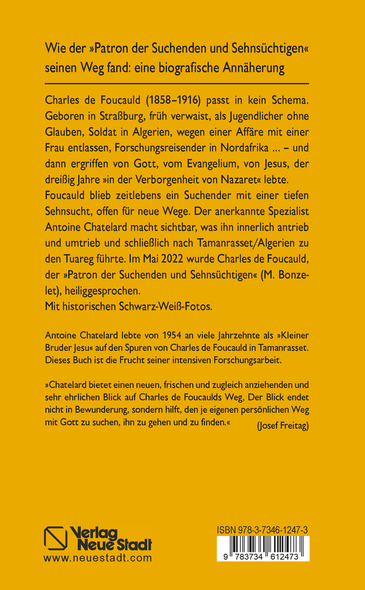 "(...) Antoine Chatelard, der viele Jahrzehnte als „Kleiner Bruder“ in einer Ordensgemeinschaft lebte, die dem Geiste von Charles de Foucauld verpflichtet ist, hat dessen spirituellen Weg nachgezeichnet. Seine intensiven Forschungsarbeiten hat er um das Jahr 2000 seinen Ordensgeschwistern vorgelegt. Nun wurden sie anlässlich der Heiligsprechung von Charles de Foucauld im Mai 2022 als Buch veröffentlicht. Es gibt gestützt auf die Briefe und Schriften „Bruder Karls“ einen beeindruckenden Blick auf die vielen Wendungen seines Lebens frei, die stets das eine Ziel verfolgen: immer getreuer Jesus nachzufolgen."