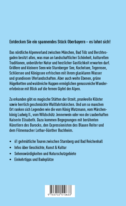 Ein spannendes Stück BayernDas nördliche Alpenvorland zwischen München, Bad Tölz und Berchtesgaden besitzt alles, was man an landschaftlicher Schönheit, kulturellen Traditionen, unberührter Natur und herzlicher Gastlichkeit erwarten darf. Größere und kleinere Seen wie Starnberger See, Kochelsee, Tegernsee, Schliersee und Königssee erfrischen mit ihrem glasklaren Wasser und grandiosen Uferland-schaften. Aber auch weite Ebenen, grüne Hügelketten und waldreiche Kuppen ermöglichen genussreiche Wandererlebnisse mit Blick auf die fernen Gipfel der Alpen.Zu erkunden gibt es magische Stätten der Urzeit, prunkvolle Klöster sowie herrlich geschmückte Wallfahrtskirchen. Und um so manchen Ort ranken sich Legenden wie die vom König Watzmann, vom Märchenkönig Ludwig II., vom Wildschütz Jennerwein oder von der zauberhaften Kaiserin Elisabeth. Dazu kommen Begegnungen mit berühmten Künstlern des Barock, den Expressionisten des Blauen Reiters und dem Filmemacher Lothar-Günther Buchheim.Entdecken Sie ein spannendes Stück Oberbayern - es lohnt sich! - 55 gehmütliche Touren zwischen Starnberg und Bad Reichenhall - Infos über Geschichte, Kunst & Kultur - Sehenswürdigkeiten und Naturschutzgebiete - Einkehrtipps und Badeplätze