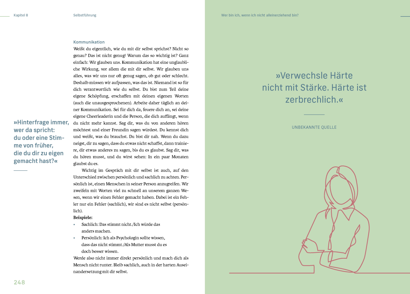 Caroline Uhl, selbst Psychologin und Personalerin, hilft durch die Verknüpfung von psychologischem Wissen und eigener Erfahrung anderen Müttern, einen ganzheitlichen Blick auf ihre Situation zu werfen. Zudem teilen andere alleinerziehende Mütter ihre Erfahrungen und geben Einblicke in die Vielfalt und die Chancen des Alleinerziehendseins, sodass deutlich wird, dass man mit seinen Fragen und Problemen nicht allein ist und andere Frauen ähnliche Erfahrungen machen. Zusätzlich zeigen Expert:innen Wege und Strategien, wie man sich selbst nicht verliert und die selbst gesteckten Ziele erreicht. Darüber hinaus finden Leserinnen Inspiration und Anregungen durch Impulse, Perspektivwechsel, Coachingfragen, Erfahrungsberichte und Auflistungen von Anlaufstellen.