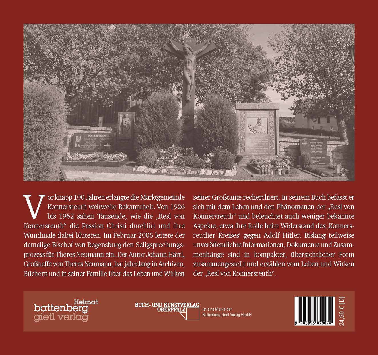 Vor knapp 100 Jahren erlangte die Marktgemeinde Konnersreuth weltweite Bekanntheit. Von 1926 bis 1962 sahen Tausende, wie die "Resl von Konnersreuth" die Passion Christi durchlitt und ihre Wundmale dabei bluteten. Im Februar 2005 leitete der damalige Bischof von Regensburg den Seligsprechungsprozess für Theres Neumann ein.Der Autor Johann Härtl, Großneffe von Theres Neumann, hat jahrelang in Archiven, Büchern und in seiner Familie über das Leben und Wirken seiner Großtante recherchiert. In seinem Buch befasst er sich mit dem Leben und den Phänomenen der "Resl von Konnersreuth" und beleuchtet auch weniger bekannte Aspekte, etwa ihre Rolle beim Widerstand des "Konnersreuther Kreises" gegen Hitler. Bislang teilweise unveröffentlichte Informationen, Dokumente und Zusammenhänge sind in kompakter, übersichtlicher Form zusammengestellt und erzählen vom Leben und Wirken der Resl von Konnersreuth.