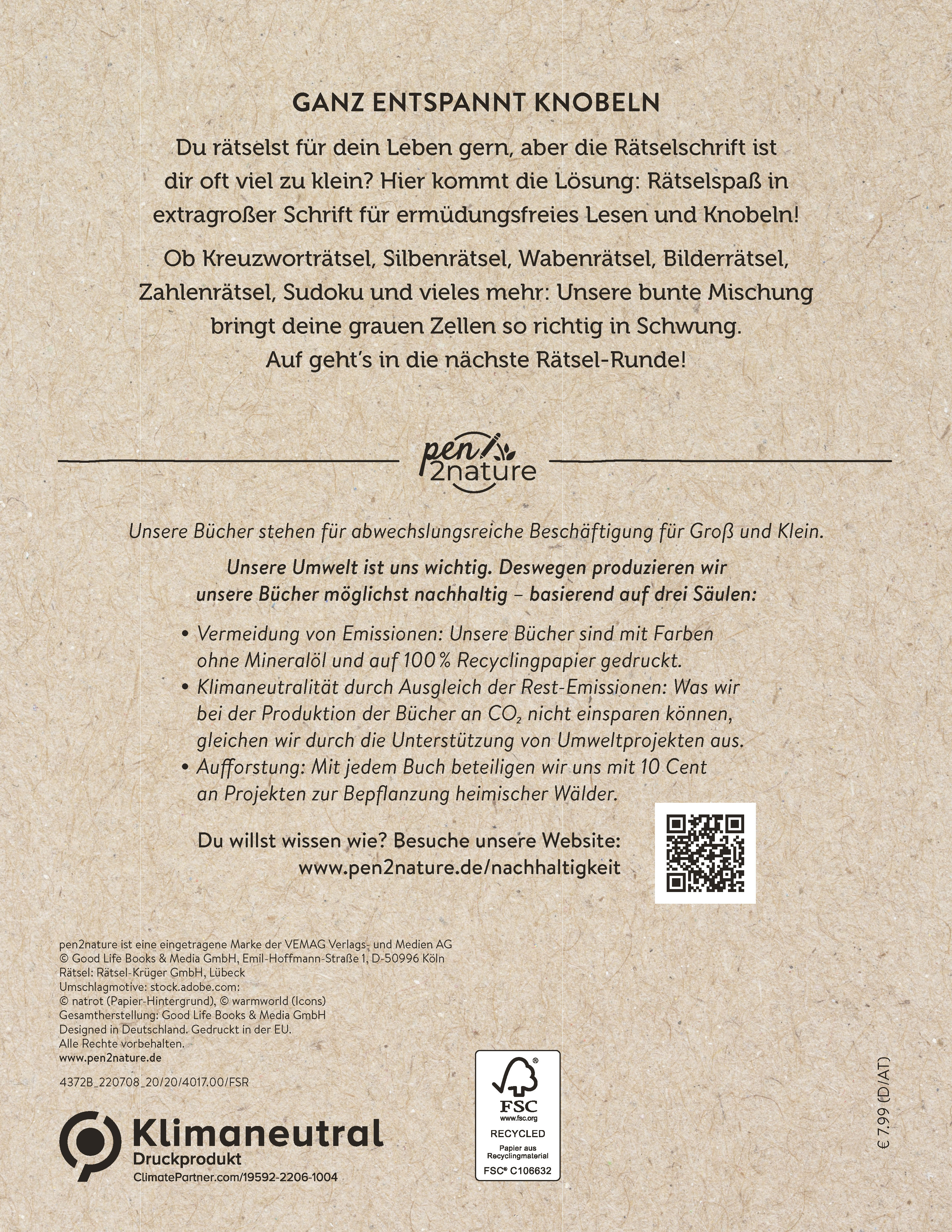 | Schlagworte | aus Recyclingpapier • Bilderrätsel • _Buch • Buch • Denksport • Gedächtnistraining • Gehirnjogging • Großdruck • Großdruckrätsel • große Schrift • Großschrift • klimaneutral • Klimaneutrales Buch • klimapositiv • Klimawandel • Kreuzworträtsel • nachhaltiges Geschenk Buch • Nachhaltigkeit • ökologische Bücher • p2n • pen 2 nature • pen2nature • pen to nature • Pflanzenfarben • Rätsel • Rätselbuch • Rätselmix • Rätseln • Rätselspaß • Recycling • Recyclingpapier • Rentner • Schwedenrätsel • Senioren • Seniorenrätsel • Silbenrätsel • Sudoku • umweltbewusst • umweltfreundliche Bücher • Umweltschutz • Umweltverlag • Wabenrätsel • wörtersuchen • Zahlenrätsel • Zero Waste |