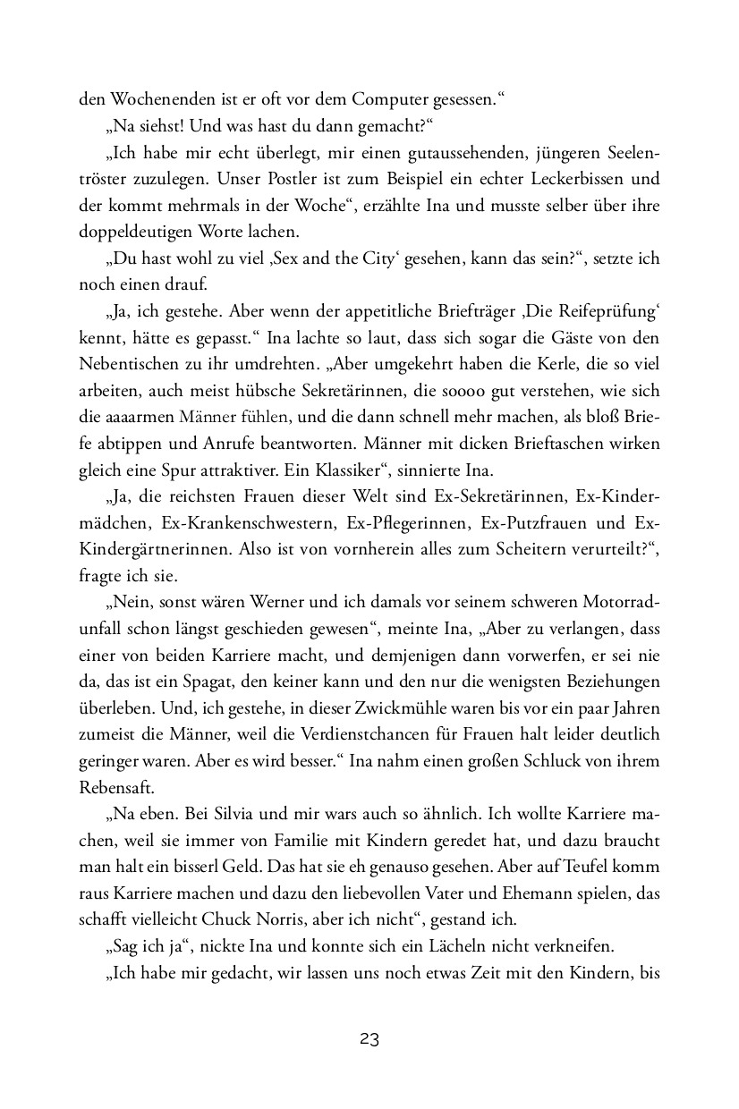 Drama oder Komödie? Diese Frage stellt sich Maximilian Glück als Hauptfigur seiner eigenen Geschichte nicht. Der sportliche Mittdreißiger fällt einem Verkupplungsversuch zum Opfer und lernt seinen persönlichen Albtraum in High Heels kennen: Nadine Schuster. Mit ihrem Leben unzufrieden, hat sie sich aufgemacht, das perfekte Bauernopfer zu finden. Geld soll er haben, zeugungsfähig soll er sein und leicht zu modellieren. Ein Mann, wie er in Nadines Buche steht, ist Maximilian allerdings nicht, doch als er das merkt, ist er bereits Papa in spe. Glück im Unglück! Nadines Plan ist vorerst aufgegangen und sie macht Maximilian das Leben zur Hölle ...