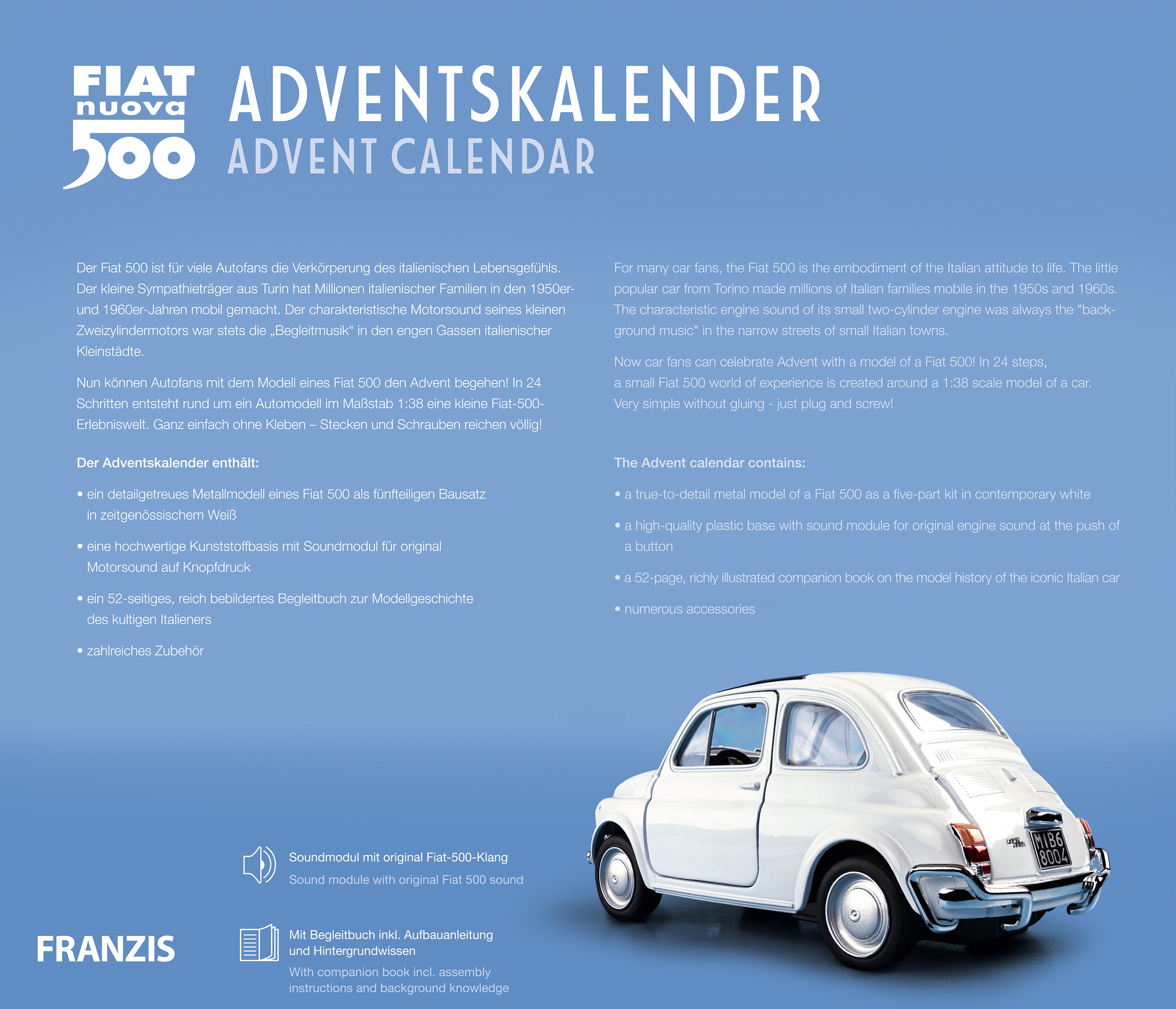 Nun können Autofans mit dem Modell eines Fiat 500 den Advent begehen! In 24 Schritten entsteht rund um ein Automodell im Maßstab 1:38 eine kleine Fiat-500-Erlebniswelt. Ganz einfach ohne Kleben - Stecken und Schrauben reichen völlig!