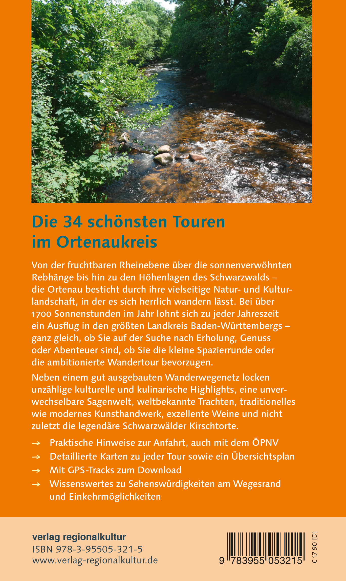 Die 34 schönsten Touren im OrtenaukreisVon der fruchtbaren Rheinebene über die sonnenverwöhnten Rebhänge bis hin zu den Höhenlagen des Schwarzwalds - die Ortenau besticht durch ihre vielseitige Natur- und Kulturlandschaft, in der es sich herrlich wandern lässt. Bei über 1700 Sonnenstunden im Jahr lohnt sich zu jeder Jahreszeit ein Ausflug in den größten Landkreis Baden-Württembergs - ganz gleich, ob Sie auf der Suche nach Erholung, Genuss oder Abenteuer sind, ob Sie die kleine Spazierrunde oder die ambitionierte Wandertour bevorzugen.Neben einem gut ausgebauten Wanderwegenetz locken unzählige kulturelle und kulinarische Highlights, eine unverwechselbare Sagenwelt, weltbekannte Trachten, traditionelles wie modernes Kunsthandwerk, exzellente Weine und nichtzuletzt die legendäre Schwarzwälder Kirschtorte. Praktische Hinweise zur Anfahrt, auch mit dem ÖPNV Detaillierte Karten zu jeder Tour sowie ein Übersichtsplan Mit GPS-Tracks zum Download Wissenswertes zu Sehenswürdigkeiten am Wegesrandund Einkehrmöglichkeiten