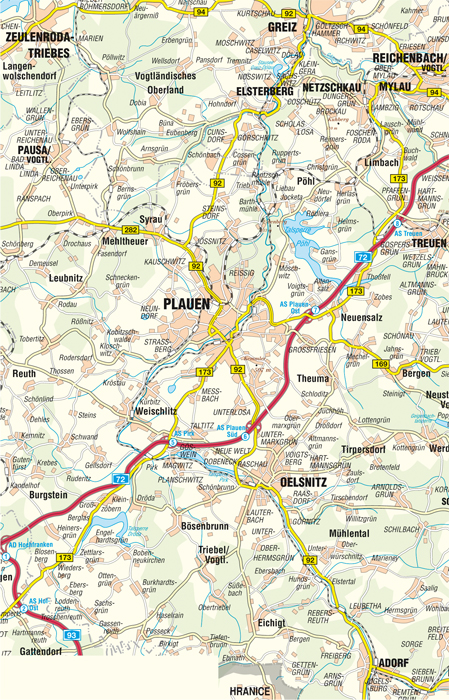 Diese Karte im Maßstab 1:33 000 umfasst das Gebiet Plauen und Umgebung, Vogtländische Schweiz, Talsperre Pöhl, Talsperre Pirk mit den Ortschaften Oelsnitz und Weischlitz.