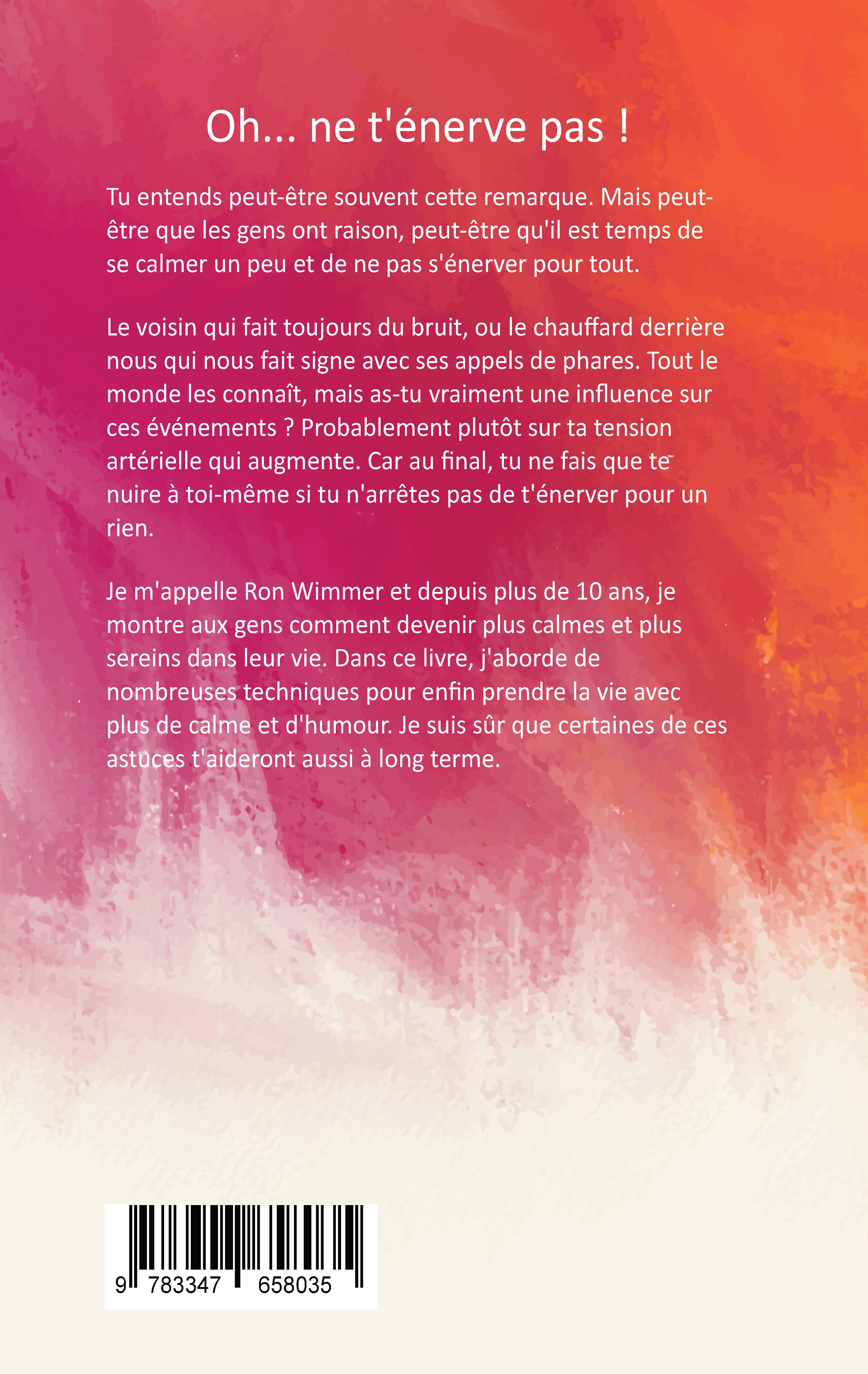 Oh... ne t'énerve pas ! Tu entends peut-être souvent cette remarque. Mais peut-être que les gens ont raison, peut-être qu'il est temps de se calmer un peu et de ne pas s'énerver pour tout.Le voisin qui fait toujours du bruit, ou le chauffard derrière nous qui nous fait signe avec ses appels de phares. Tout le monde les connaît, mais as-tu vraiment une influence sur ces événements ? Probablement plutôt sur ta tension artérielle qui augmente. Car au final, tu ne fais que te nuire à toi-même si tu n'arrêtes pas de t'énerver pour un rien. Je m'appelle Ron Wimmer et depuis plus de 10 ans, je montre aux gens comment devenir plus calmes et plus sereins dans leur vie. Dans ce livre, j'aborde de nombreuses techniques pour enfin prendre la vie avec plus de calme et d'humour. Je suis sûr que certaines de ces astuces t'aideront aussi à long terme.