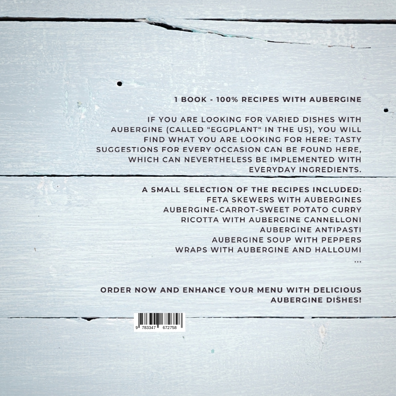 1 book - 100% recipes with aubergineIf you are looking for varied dishes with aubergine (called "eggplant" in the US), you will find what you are looking for here: Tasty suggestions for every occasion can be found here, which can nevertheless be implemented with everyday ingredients.A small selection of the recipes included:Feta skewers with auberginesAubergine-carrot-sweet potato curryRicotta with aubergine cannelloniAubergine antipastiAubergine soup with peppersWraps with aubergine and halloumi...Order now and enhance your menu with delicious aubergine dishes!